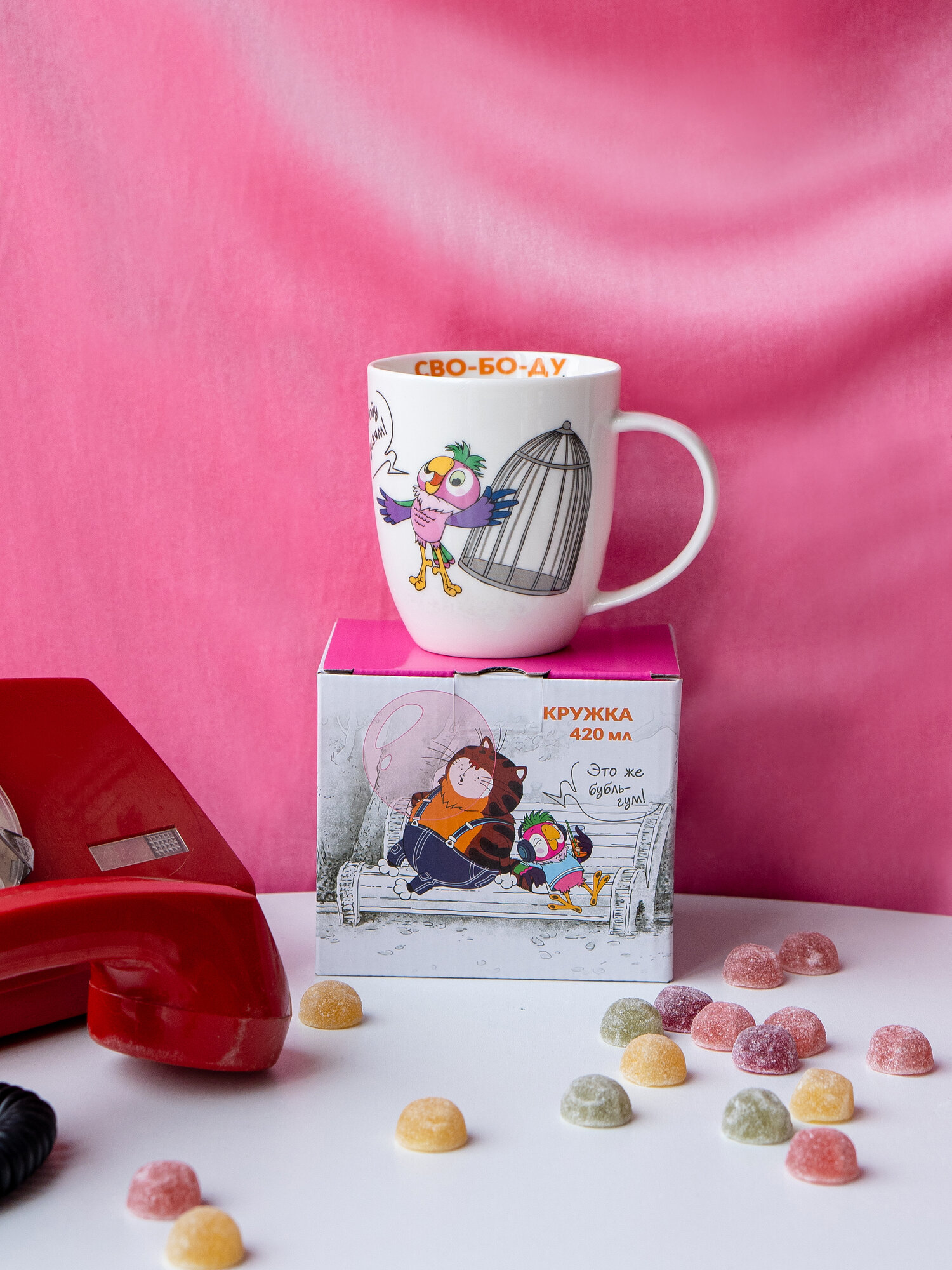 Кружка большая белая фарфор 500 мл. "Попугай Кеша" в подарочной упаковке. Коралл