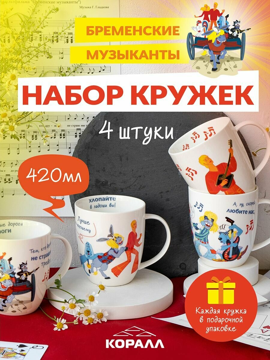 СохранитьНабор кружек фарфор 420 мл. 4 шт. "Бременские музыканты" чашки для чая в индивидуальной подарочной упаковке интересное: