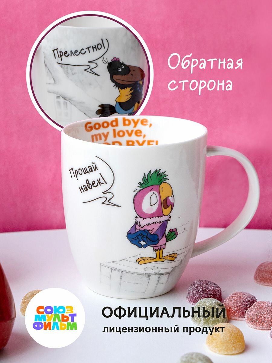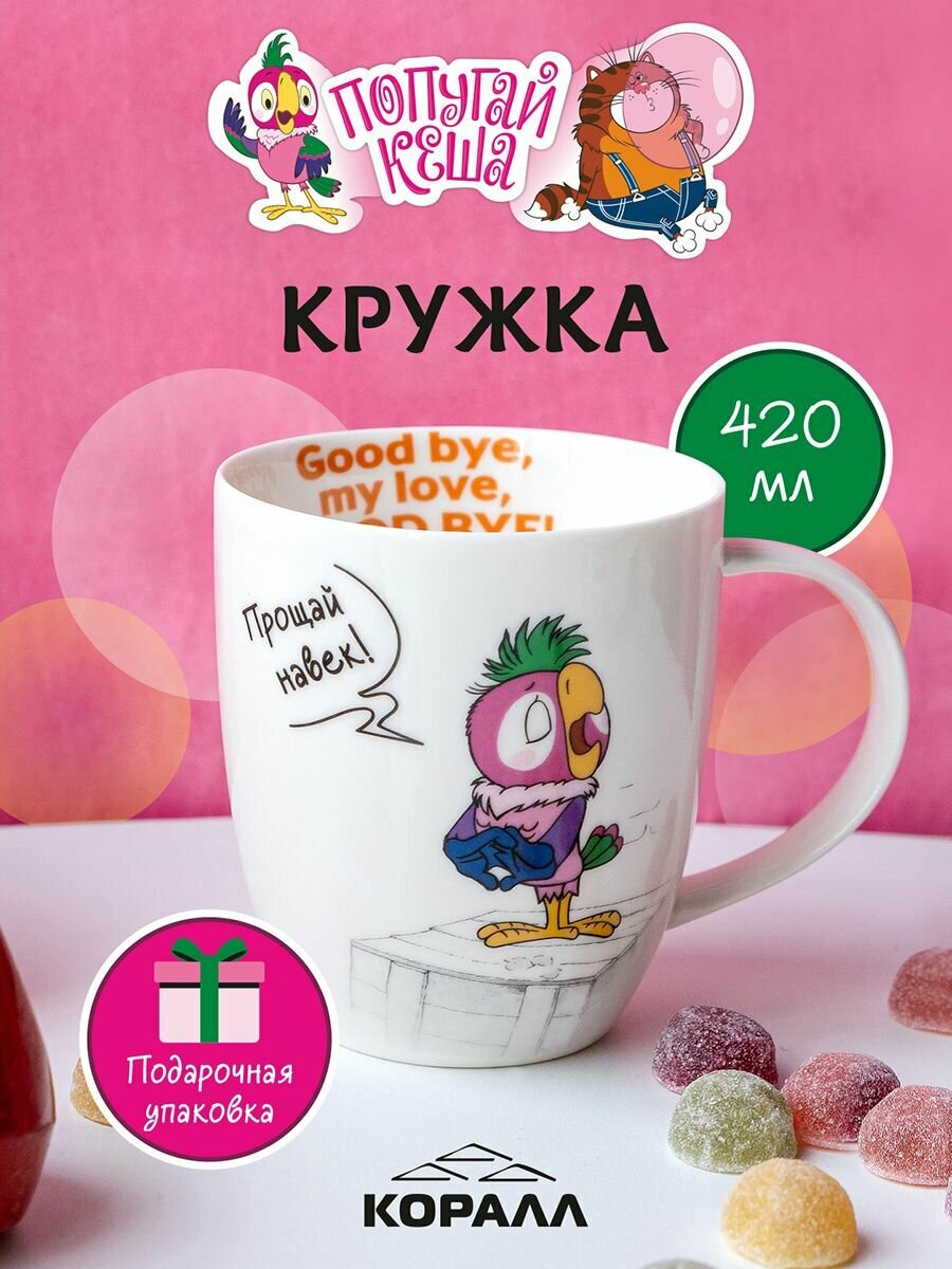 СохранитьКружка большая белая фарфор 420 мл. в подарочной упаковке Попугай Кеша "Good bye my Love, good bye!" интересное:
