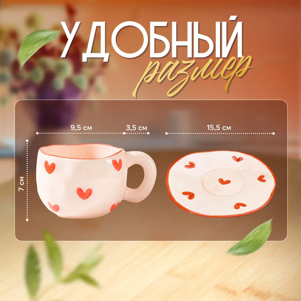 Чашка с блюдцем "Сердечки", керамическая чайная пара, 300 мл