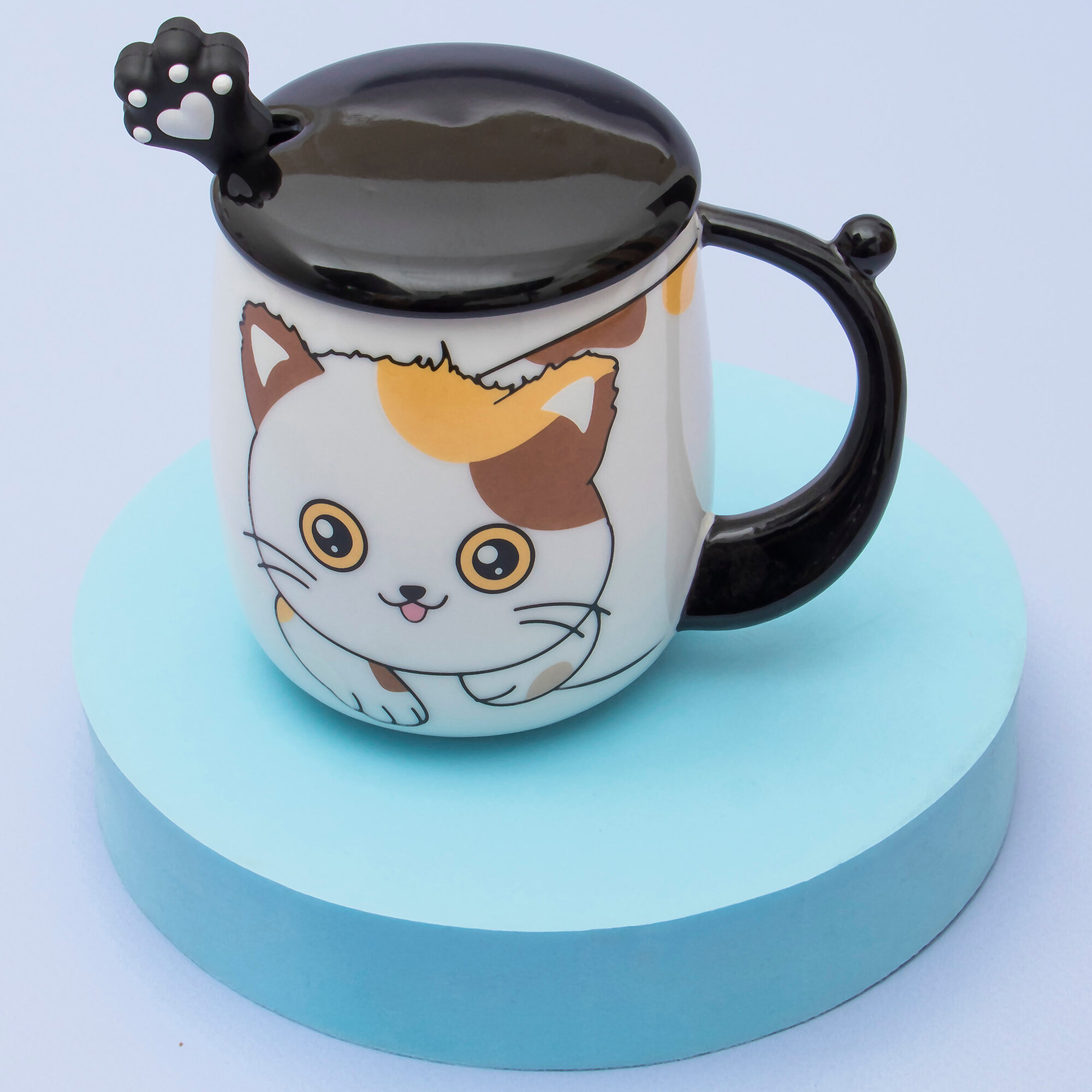 Кружка керамическая "Котик" белый 430 мл, с крышкой и ложкой, чашка детская, аниме, женская, подарочная