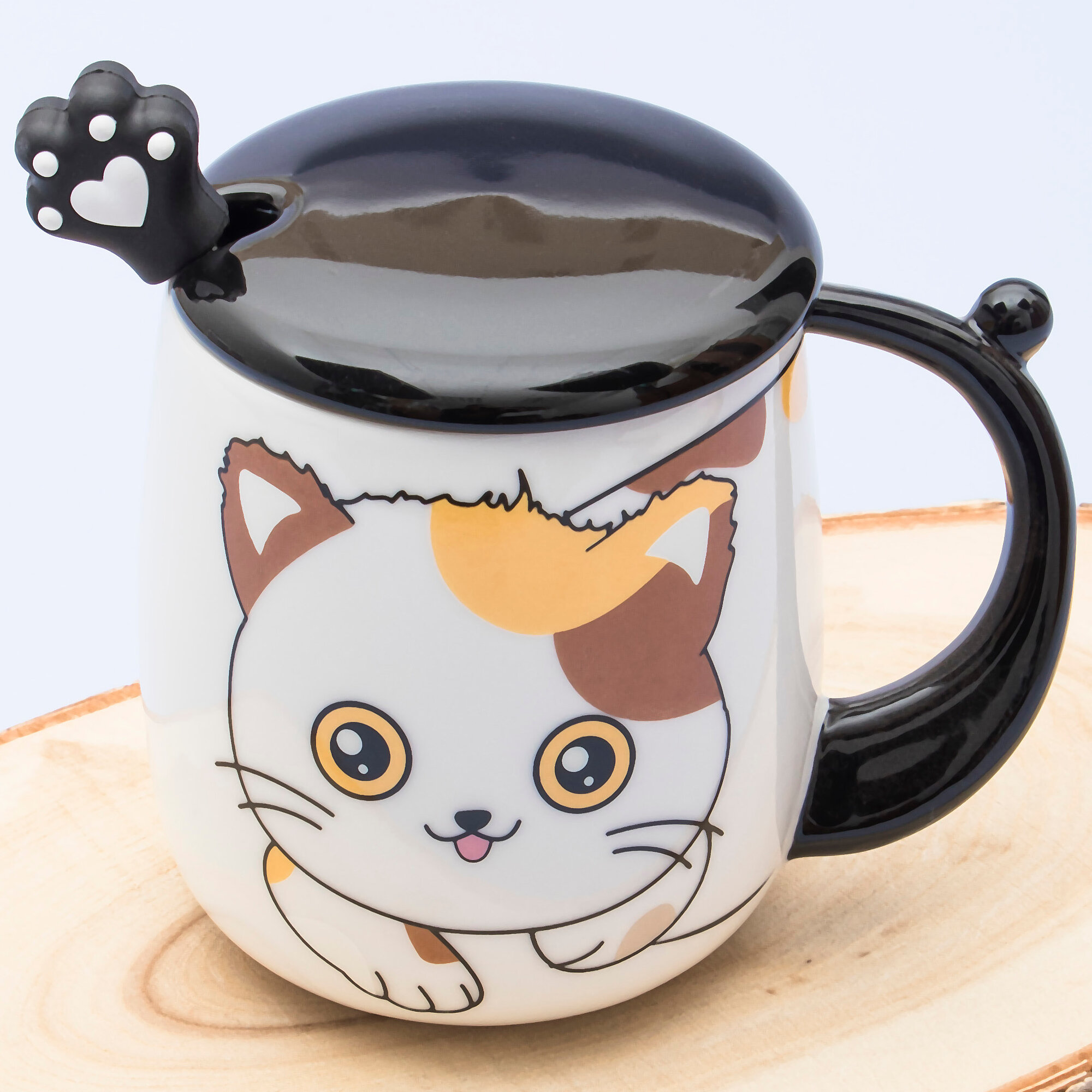 Купить Кружка керамическая "Котик" желтый 430 мл, с крышкой и ложкой, чашка детская, аниме, женская, подарочная