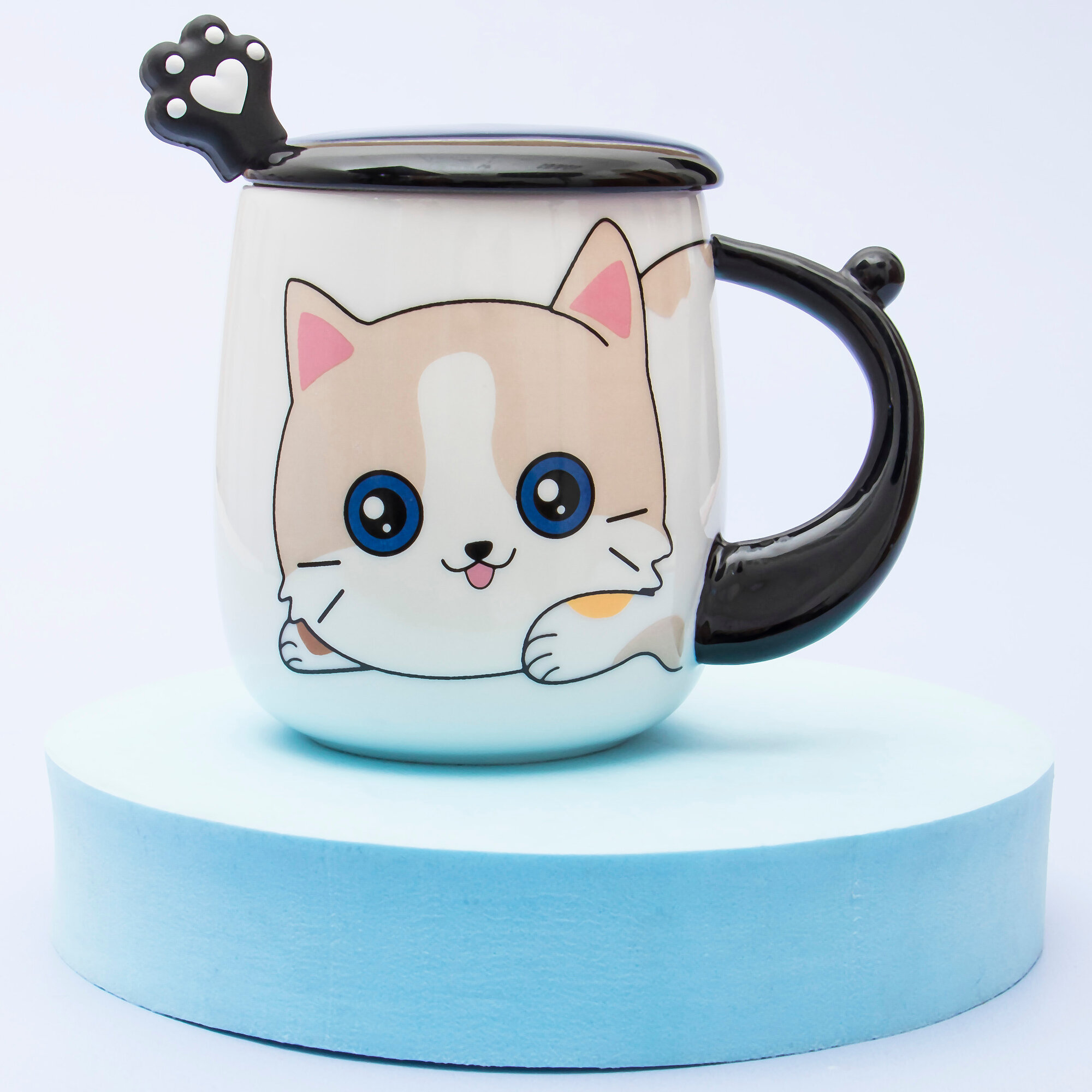Купить Кружка керамическая "Котик" бежевый 430 мл, с крышкой и ложкой, чашка детская, аниме, женская, подарочная