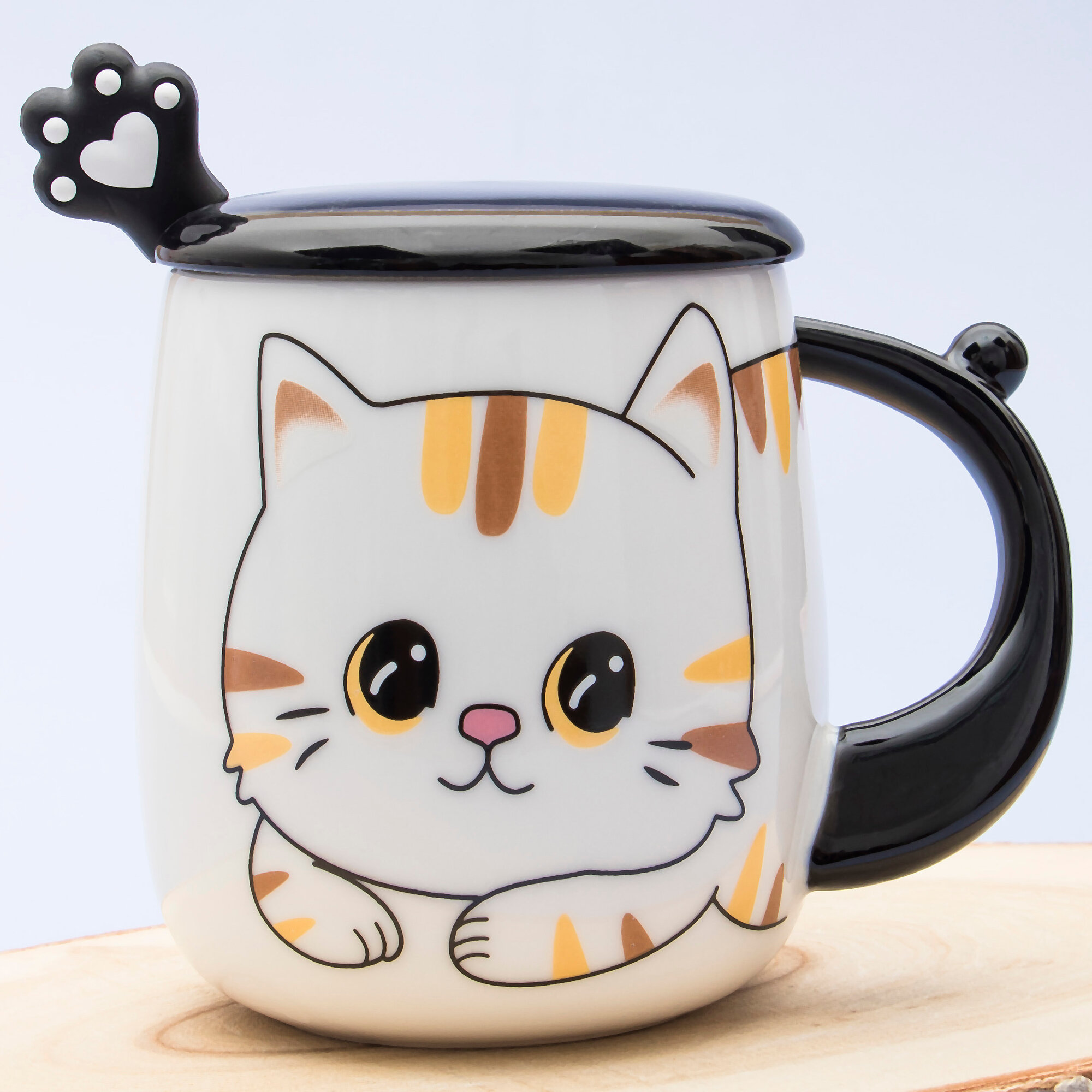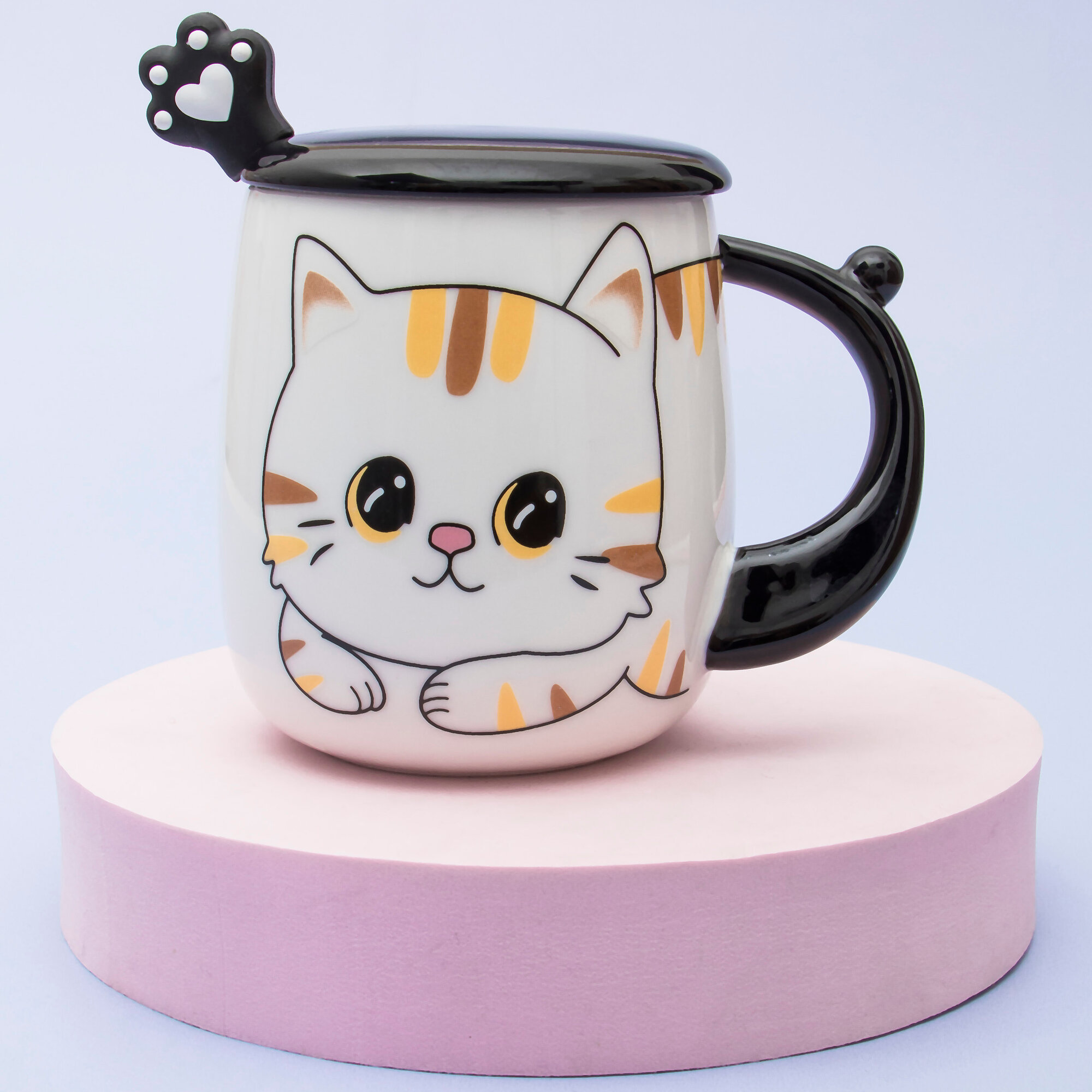 Кружка керамическая "Котик" белый 430 мл, с крышкой и ложкой, чашка детская, аниме, женская, подарочная интересное: