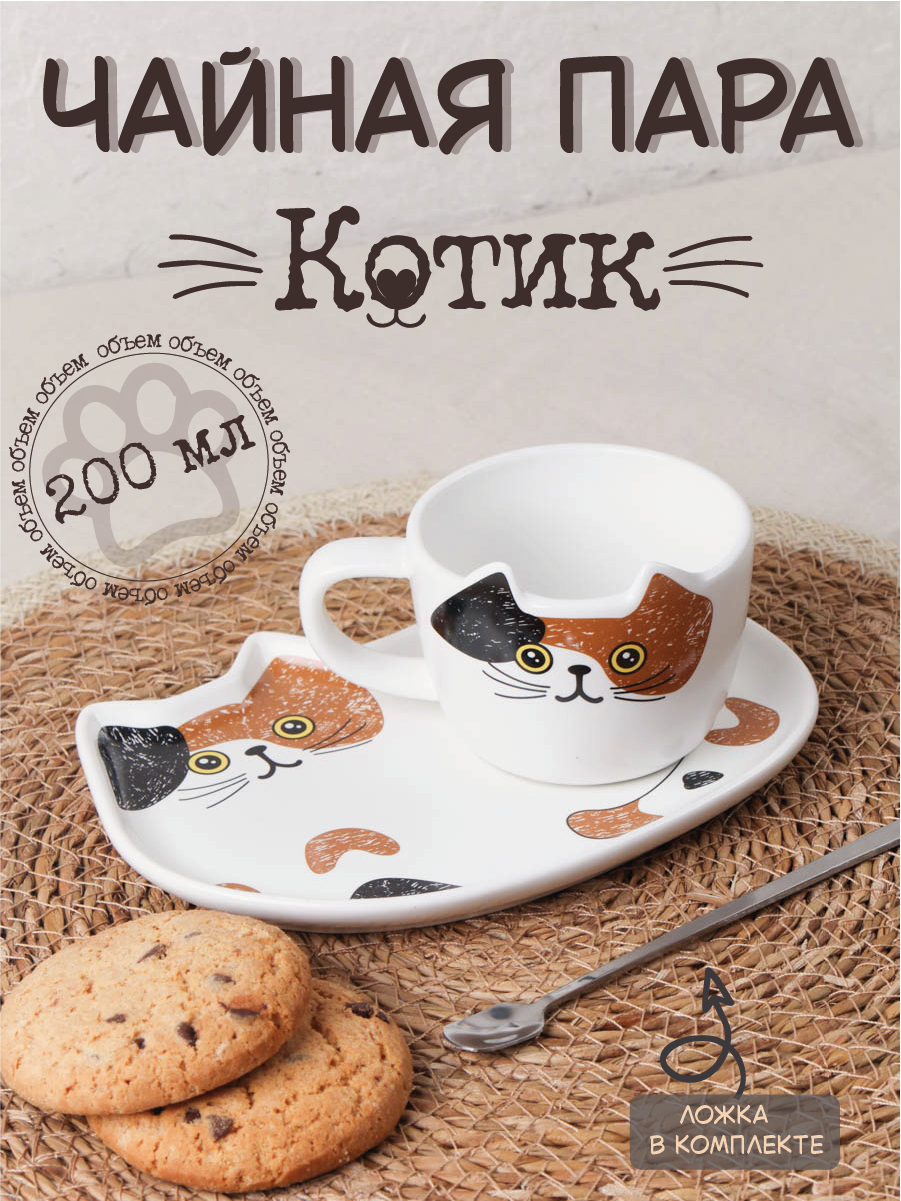 Купить Чайный пара подарочная "Котик" 200 мл с ложкой, оригинальная форма