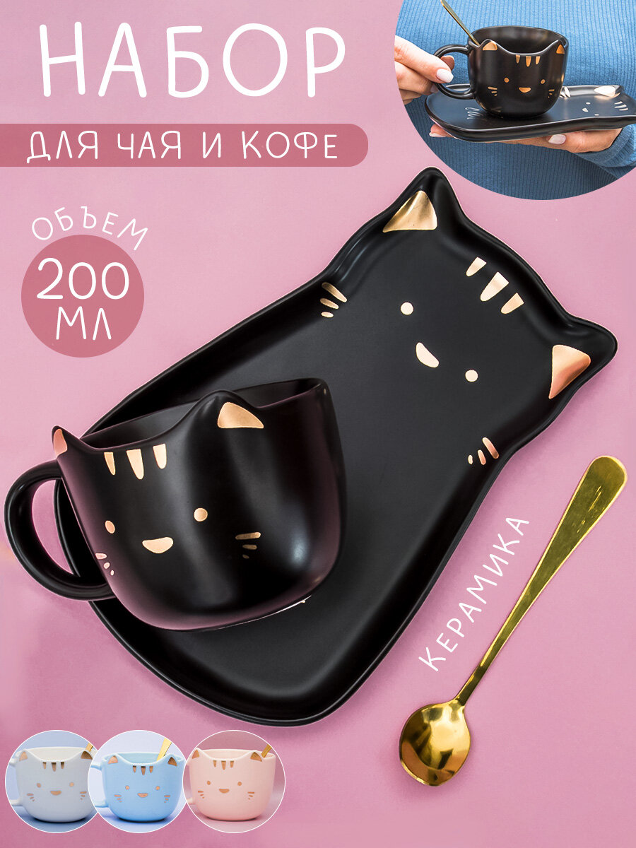 Кружка с блюдцем бамбук Котик Черный 160 мл Эврика, кофейная пара, подарочный набор женский, чашка с ложкой 14 февраля, 8 марта