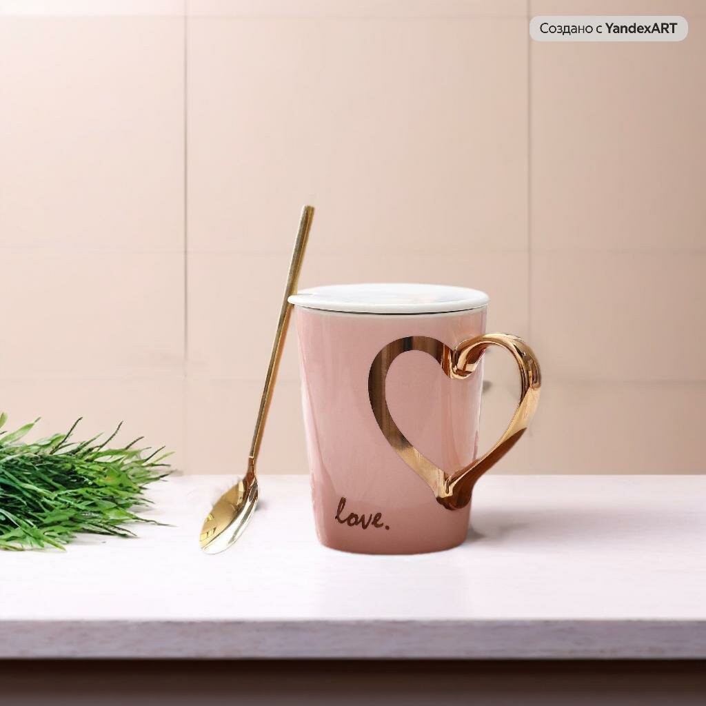 Купить Кружка керамическая Любовь Love "Золотое сердце" розовая 300 мл, с крышкой и ложкой, женская, с надписью, подарочная