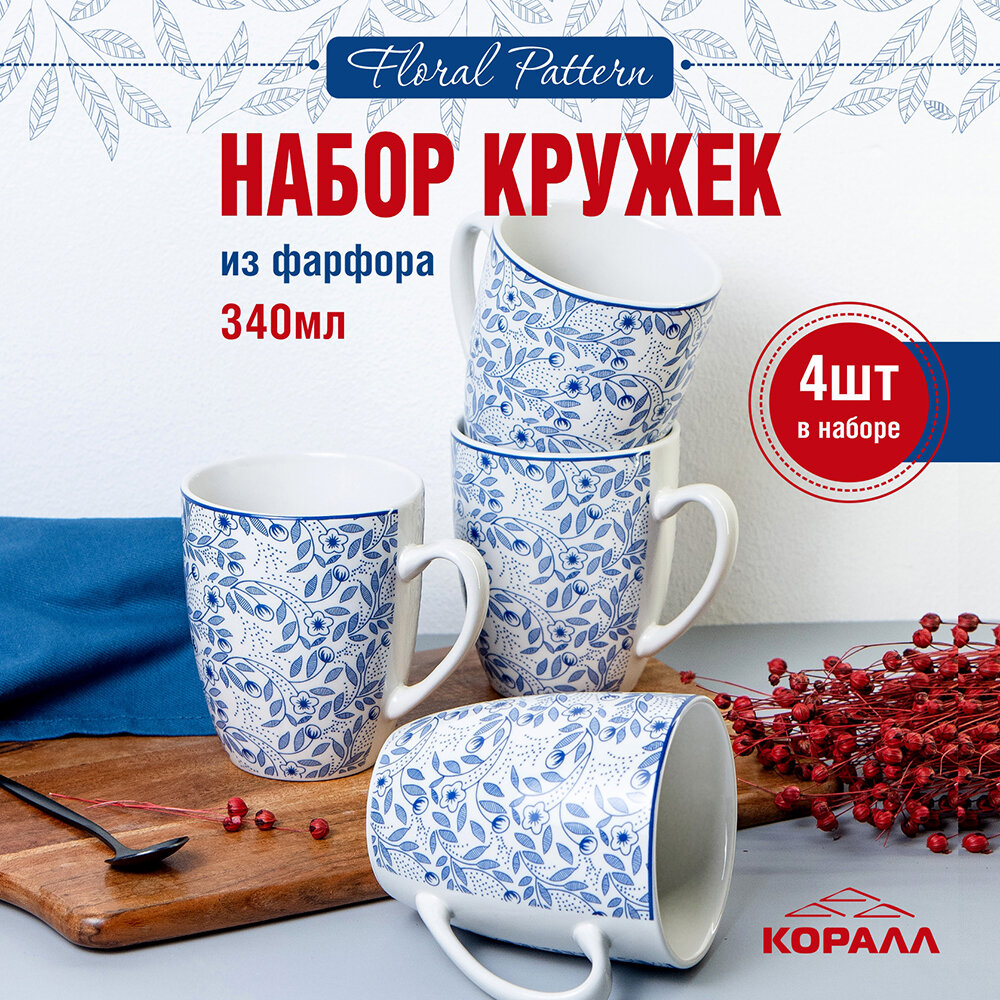 Купить Набор кружек 4 шт. 340 мл фарфор "Floral pattern" кружка для чая кофе какао. Коралл