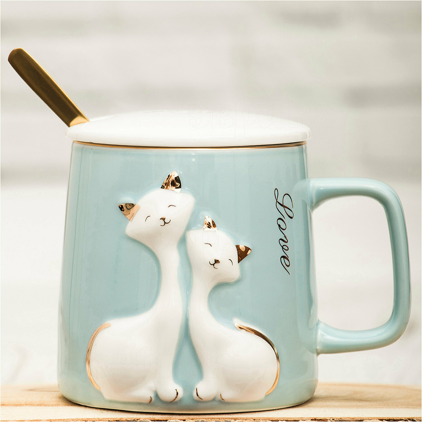 Купить Кружка Влюбленные котики (N 3) синий 410 мл, кружка с крышкой и ложкой / подарок девочке, женщине, любимой на новый год