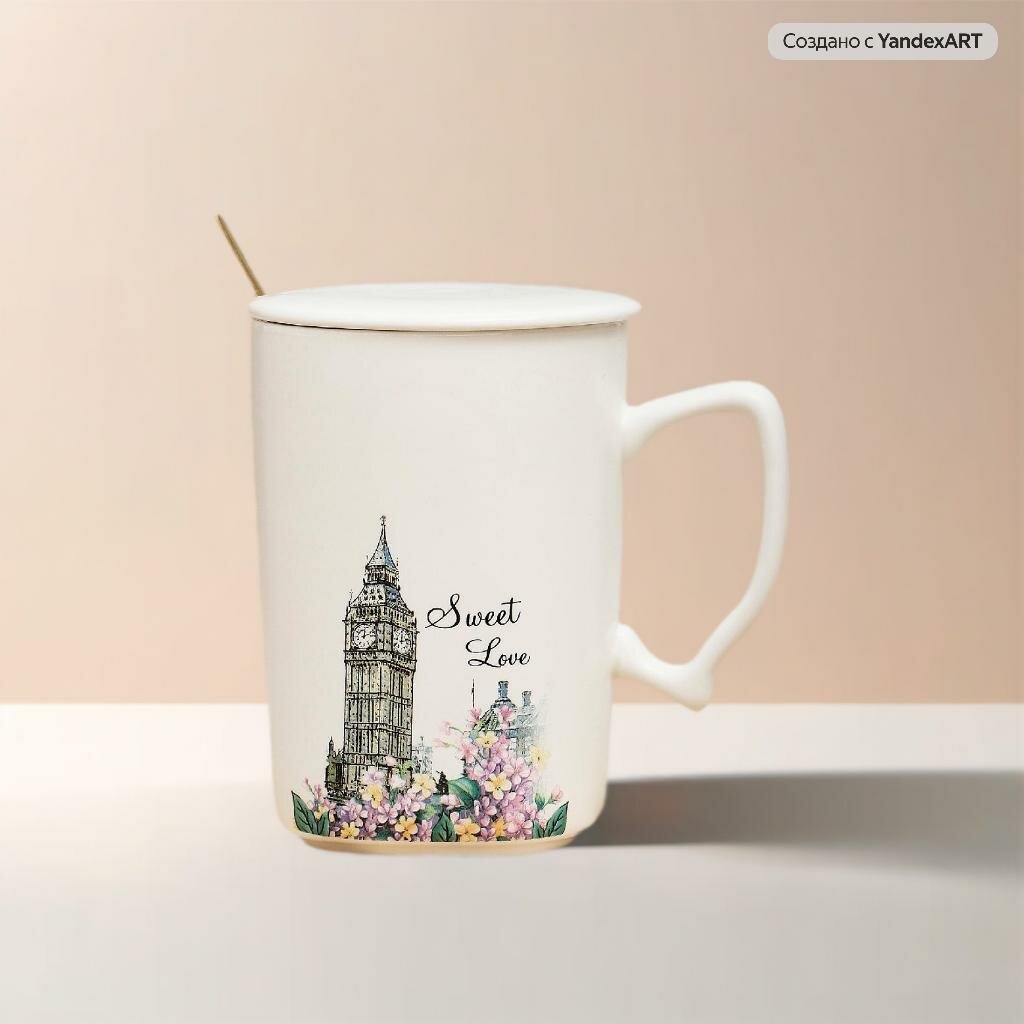 Купить Кружка фарфоровая "Биг Бен Лондон" белая 360 мл, с крышкой и ложкой, для чая и кофе, с рисунком, женская, подарочная