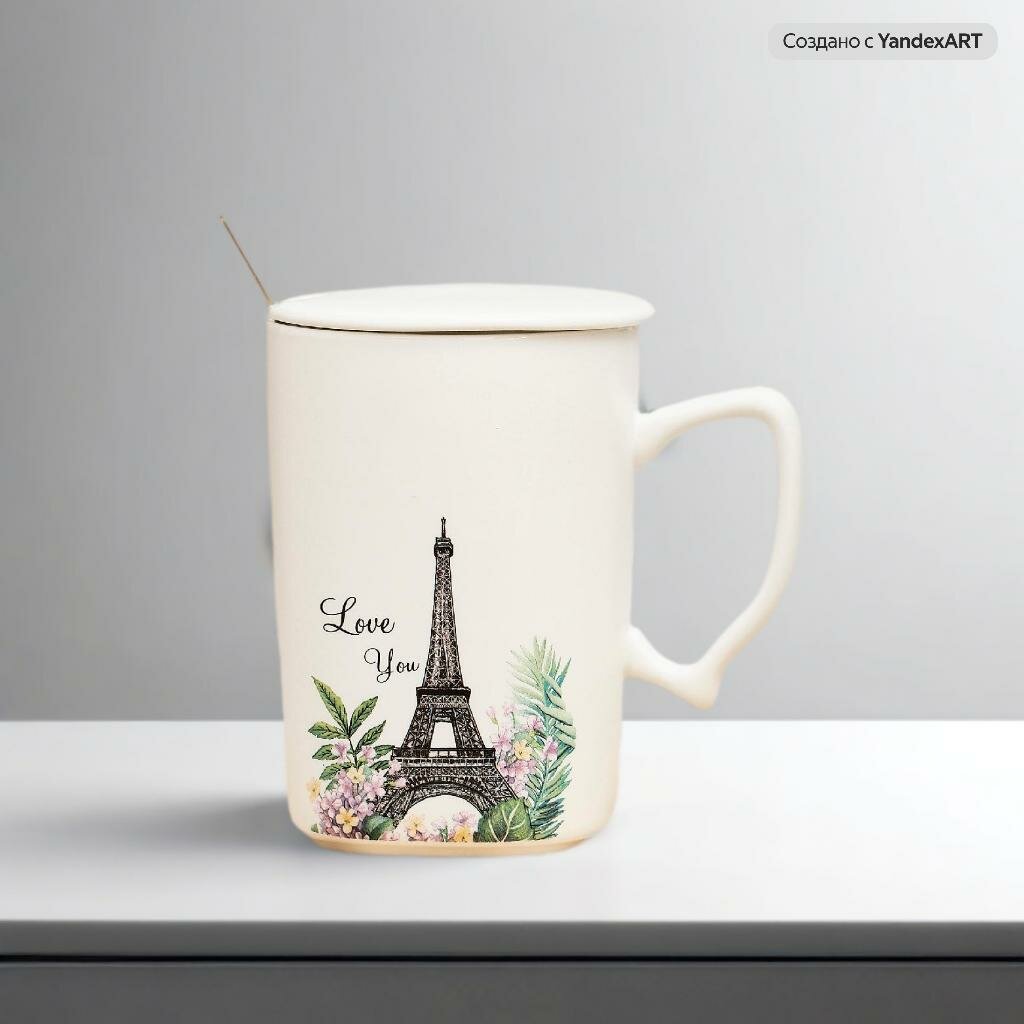 Купить Кружка фарфоровая "Эйфелева башня" белая 360 мл, с крышкой и ложкой, для чая и кофе, с рисунком, женская, подарочная