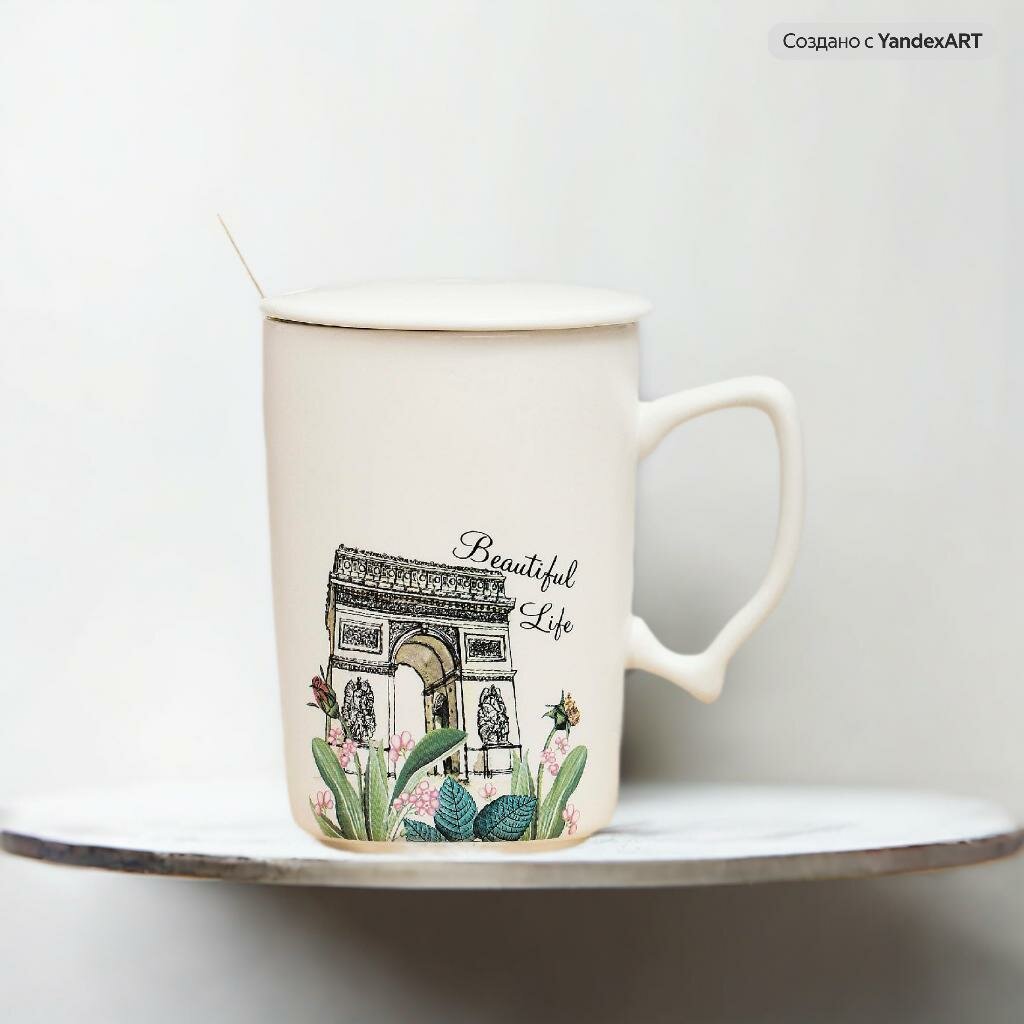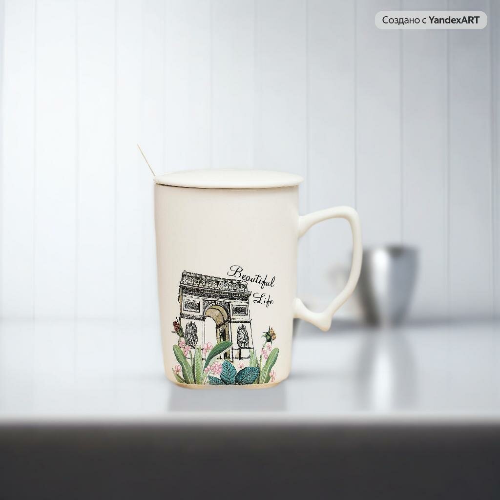 Купить Кружка фарфоровая "Триумфальная арка" белая 360 мл, с крышкой и ложкой, для чая и кофе, с рисунком, женская, подарочная