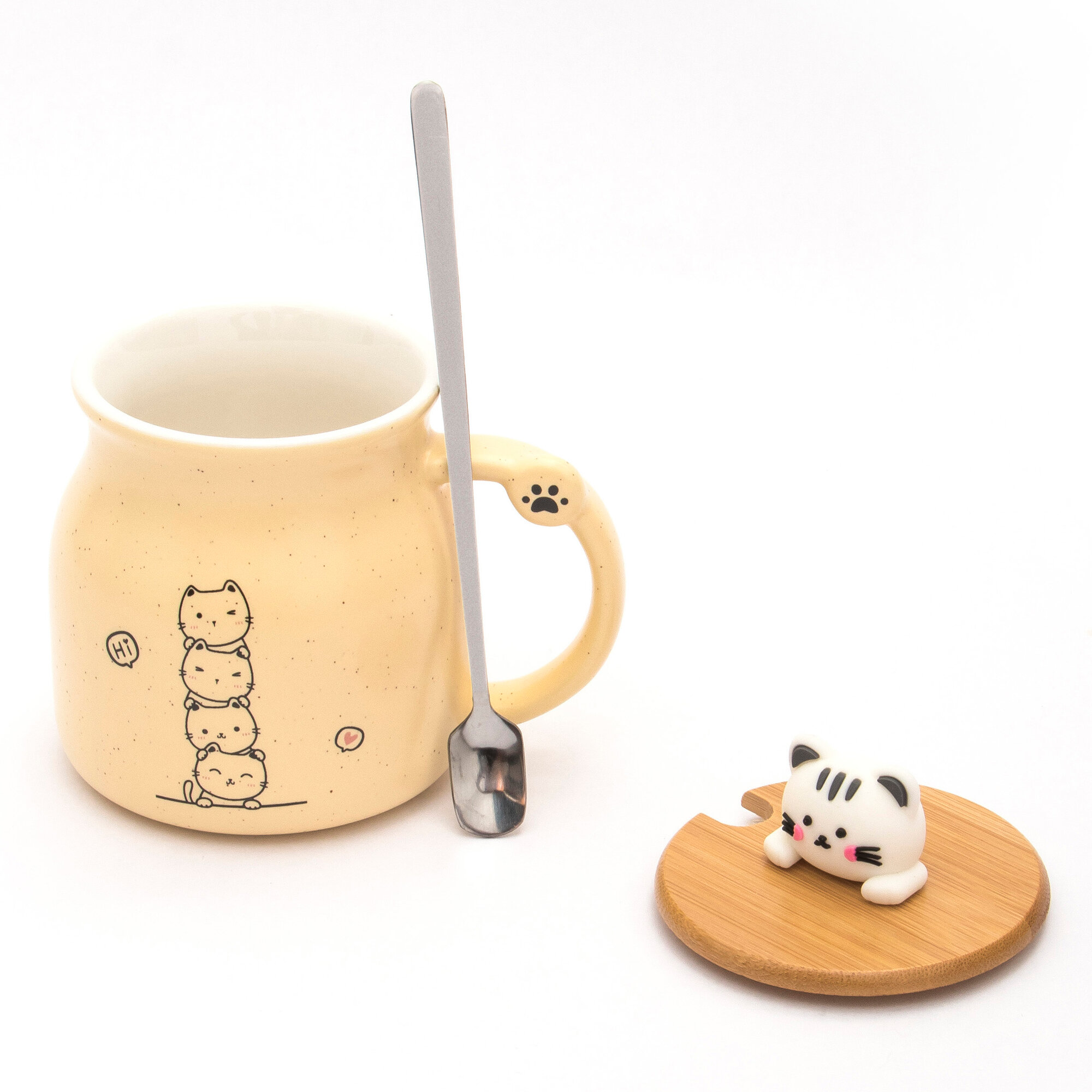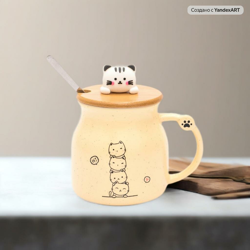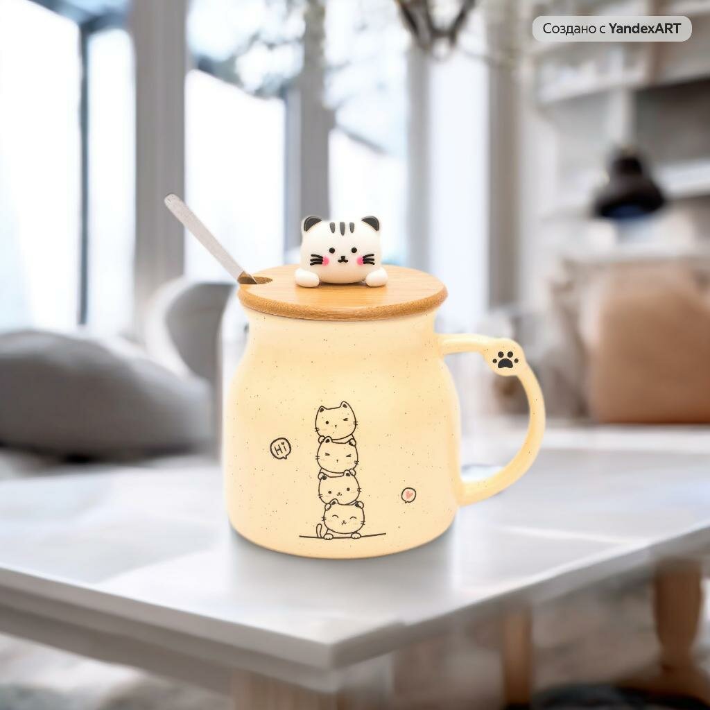 Купить Кружка Милые котики на крышке 340 мл, желтая, с ложкой, для чая и кофе, женская, подарочная