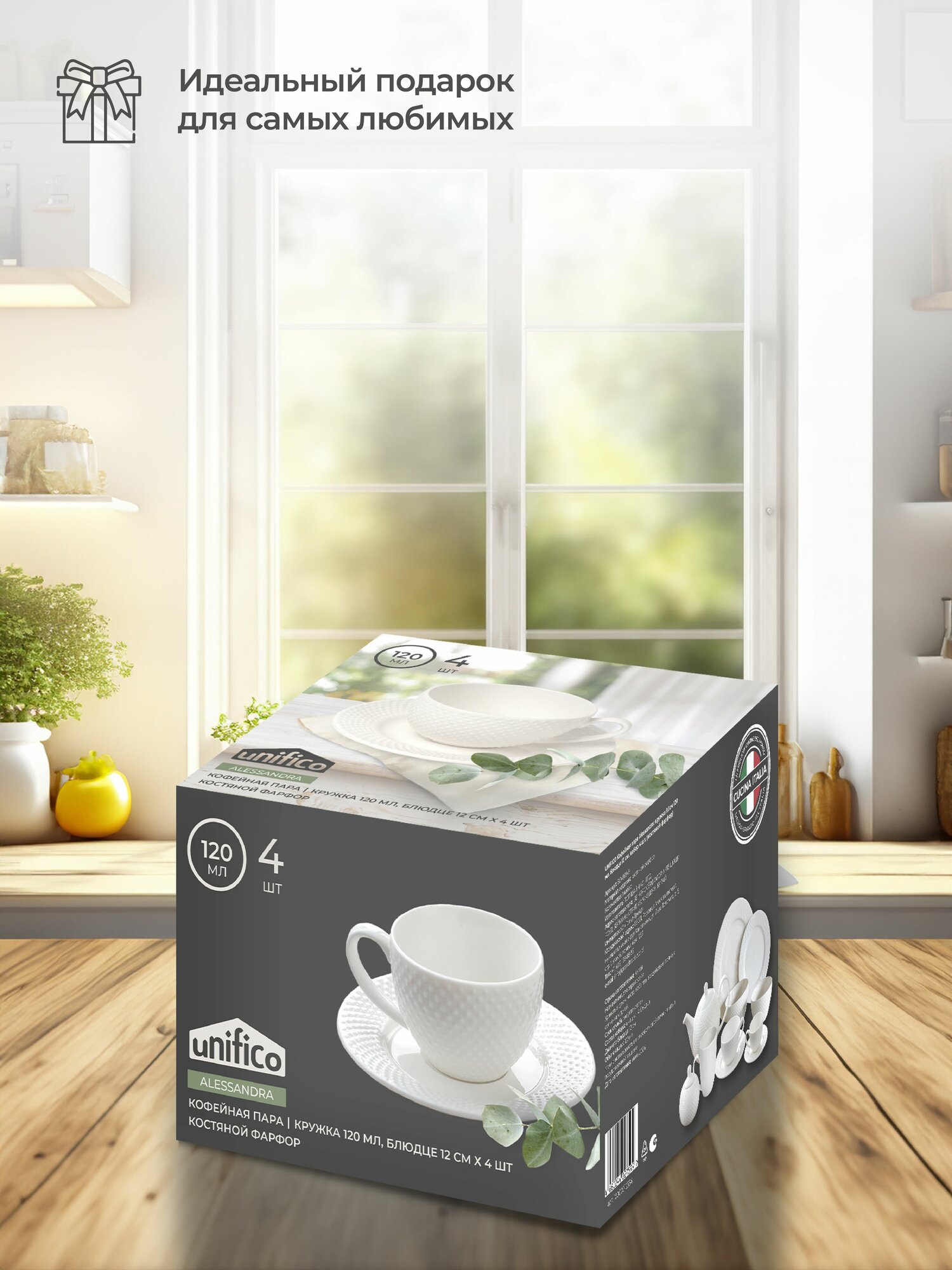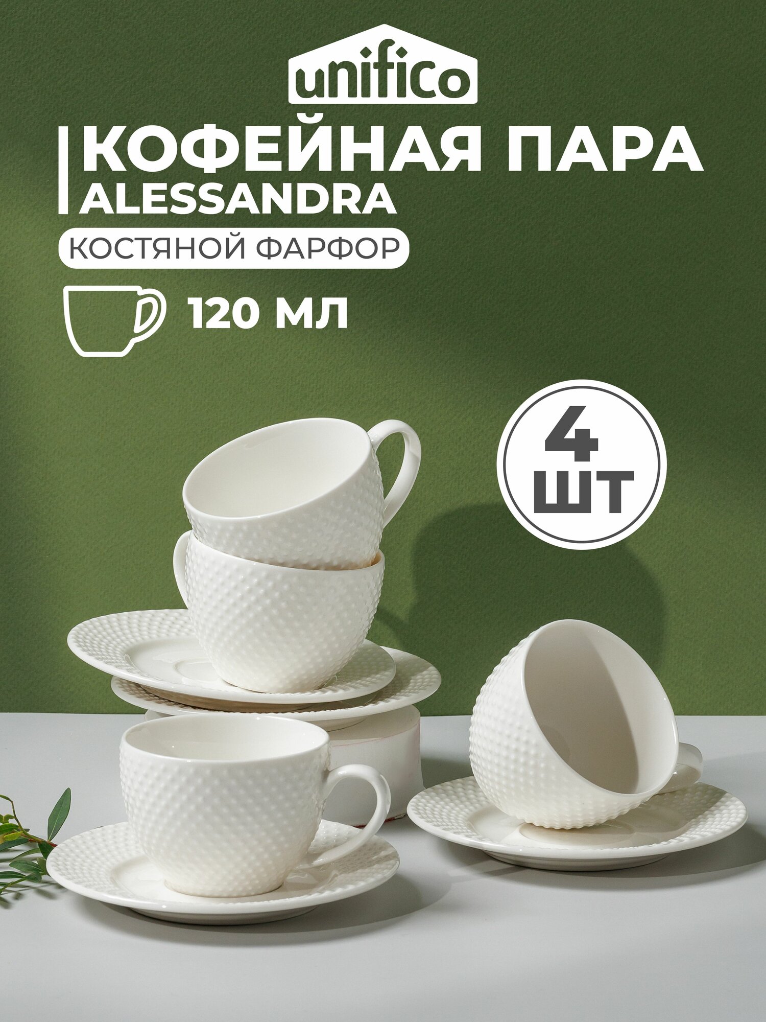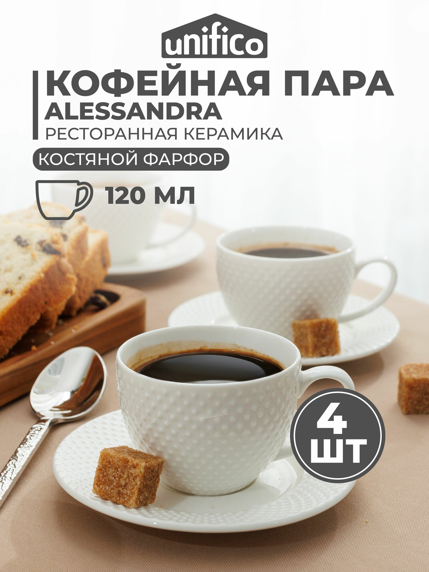 Купить Кофейная пара из костяного фарфора 4 шт. UNIFICO кружка 9,1 см 120 мл, блюдце 12 см.