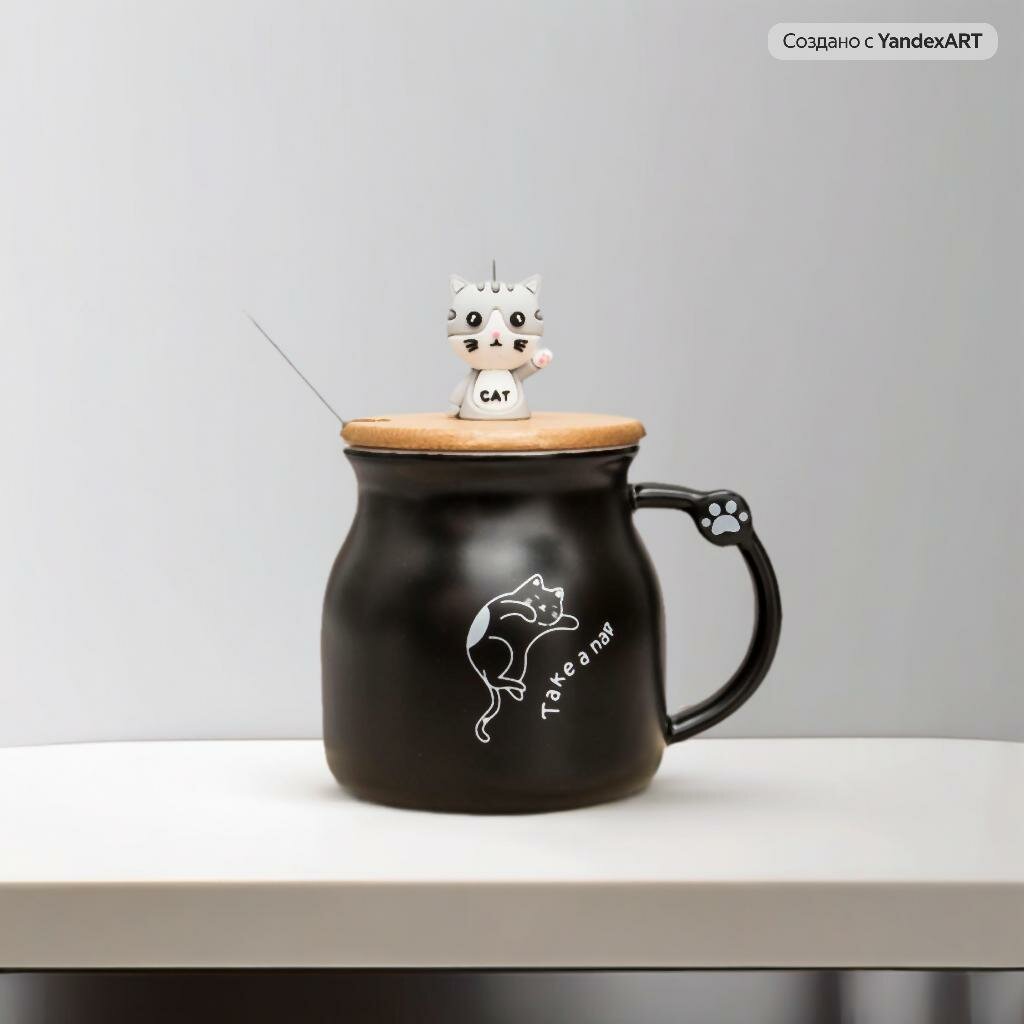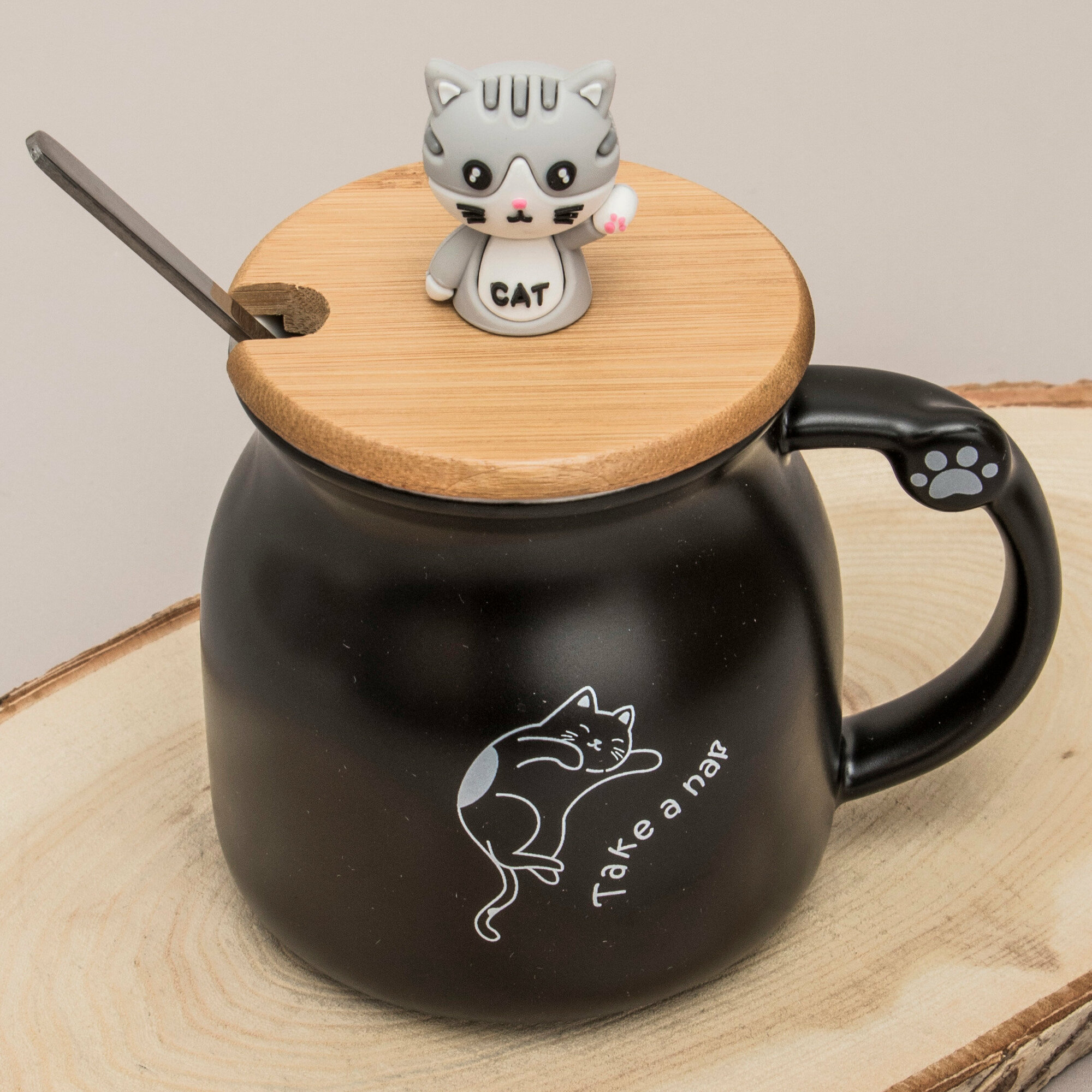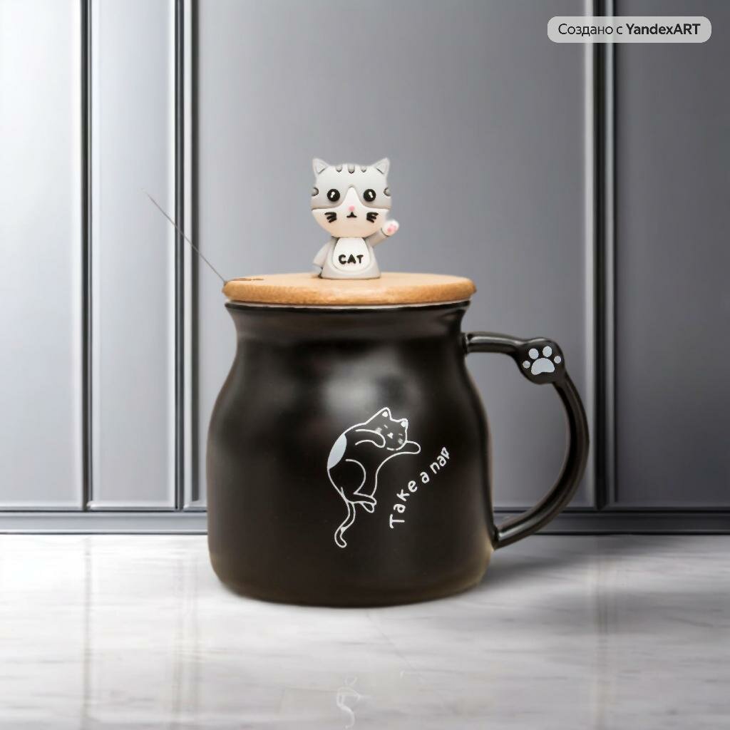 Кружка Кот с ложкой коричневый 360 мл Эврика (N 4), кружка с крышкой детская, женская, подарочная Котик, Котенок, Cat 23 февраля, 8 марта