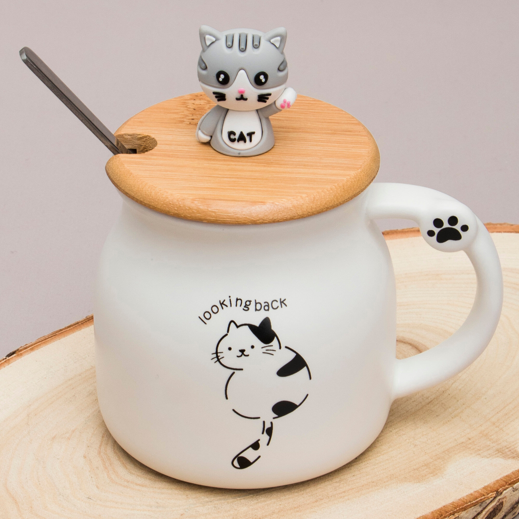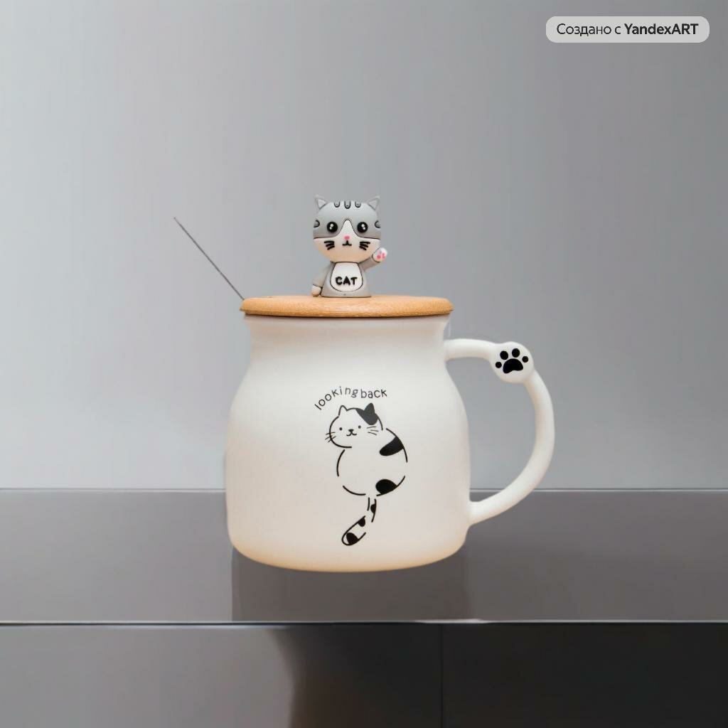Кружка Кот с ложкой коричневый 360 мл Эврика (N 4), кружка с крышкой детская, женская, подарочная Котик, Котенок, Cat 23 февраля, 8 марта