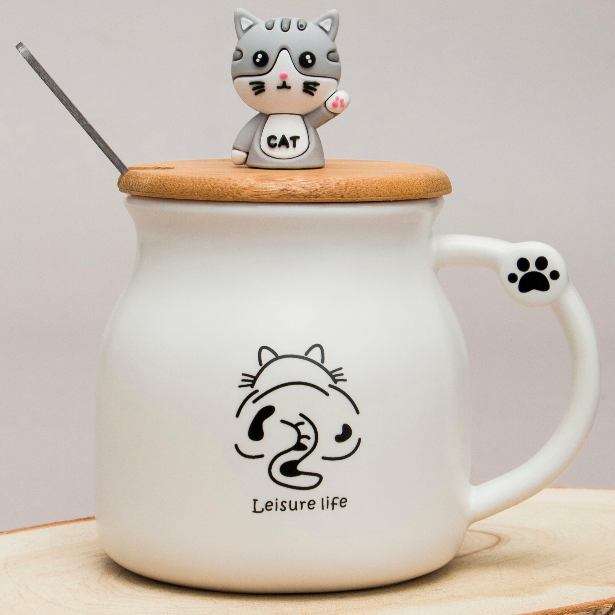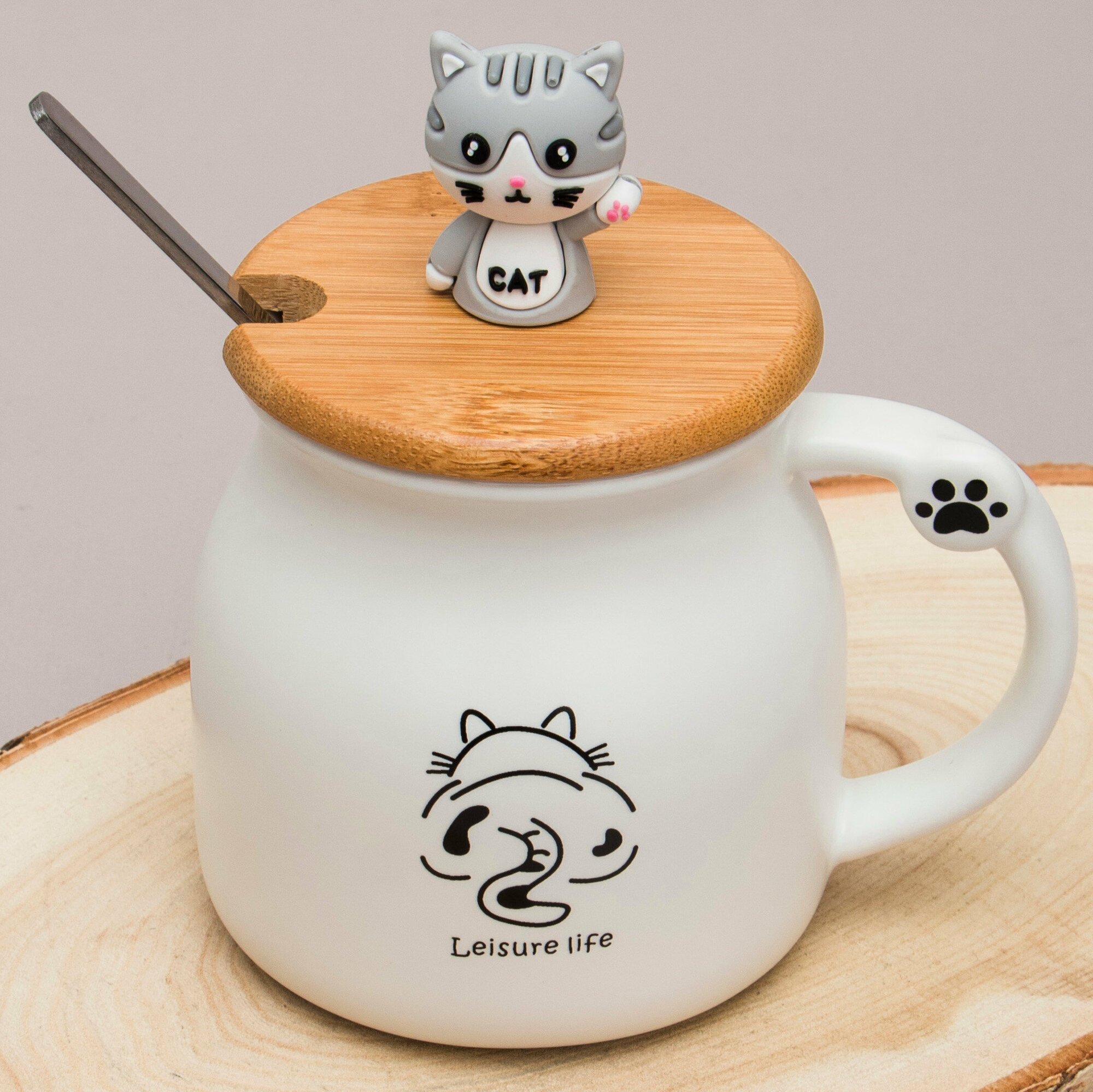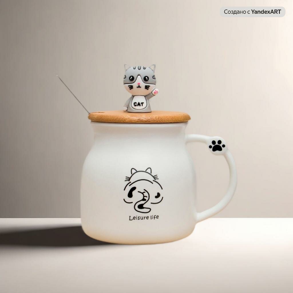 Кружка Кот с ложкой коричневый 360 мл Эврика (N 4), кружка с крышкой детская, женская, подарочная Котик, Котенок, Cat 23 февраля, 8 марта