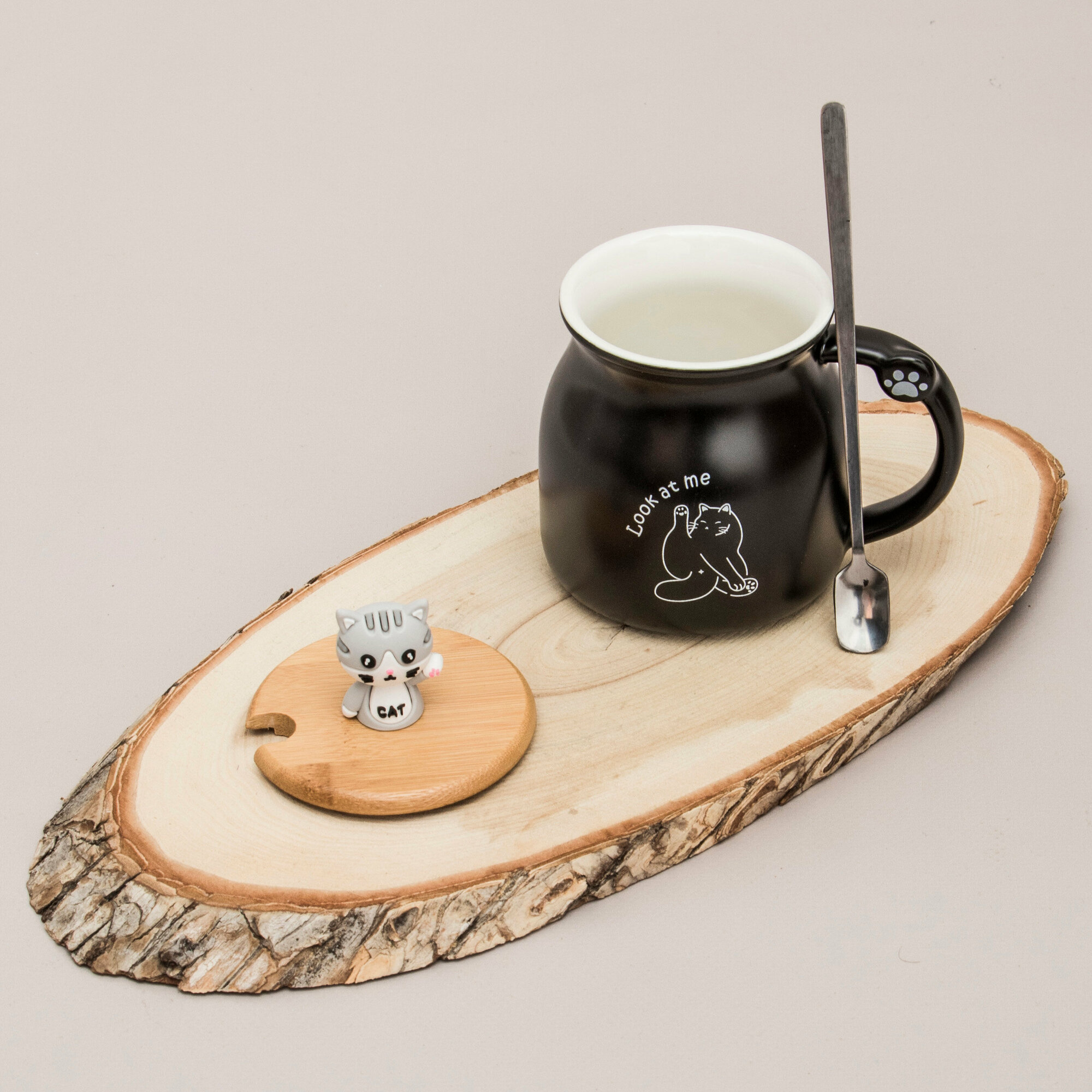 Кружка Кот с ложкой коричневый 360 мл Эврика (N 4), кружка с крышкой детская, женская, подарочная Котик, Котенок, Cat 23 февраля, 8 марта