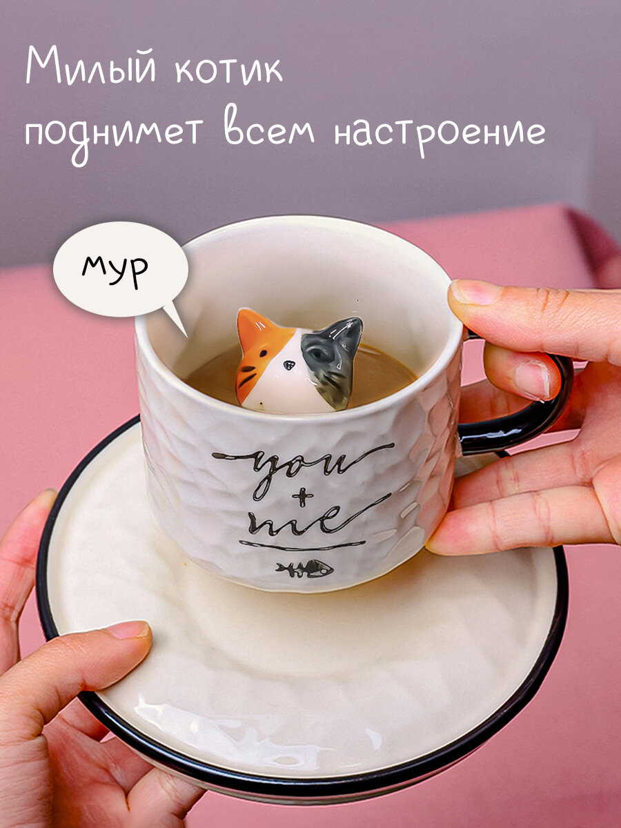 Кружка с блюдцем Котик на дне, чашка с блюдцем, чайная пара Эврика (белый, 220 мл) подарок на 14 февраля, 8 марта
