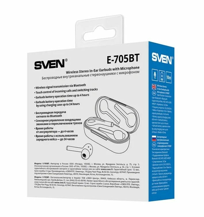 Гарнитура вкладыши Sven E-705bt (tws) черный матовый беспроводные bluetooth в ушной раковине (sv-018 .