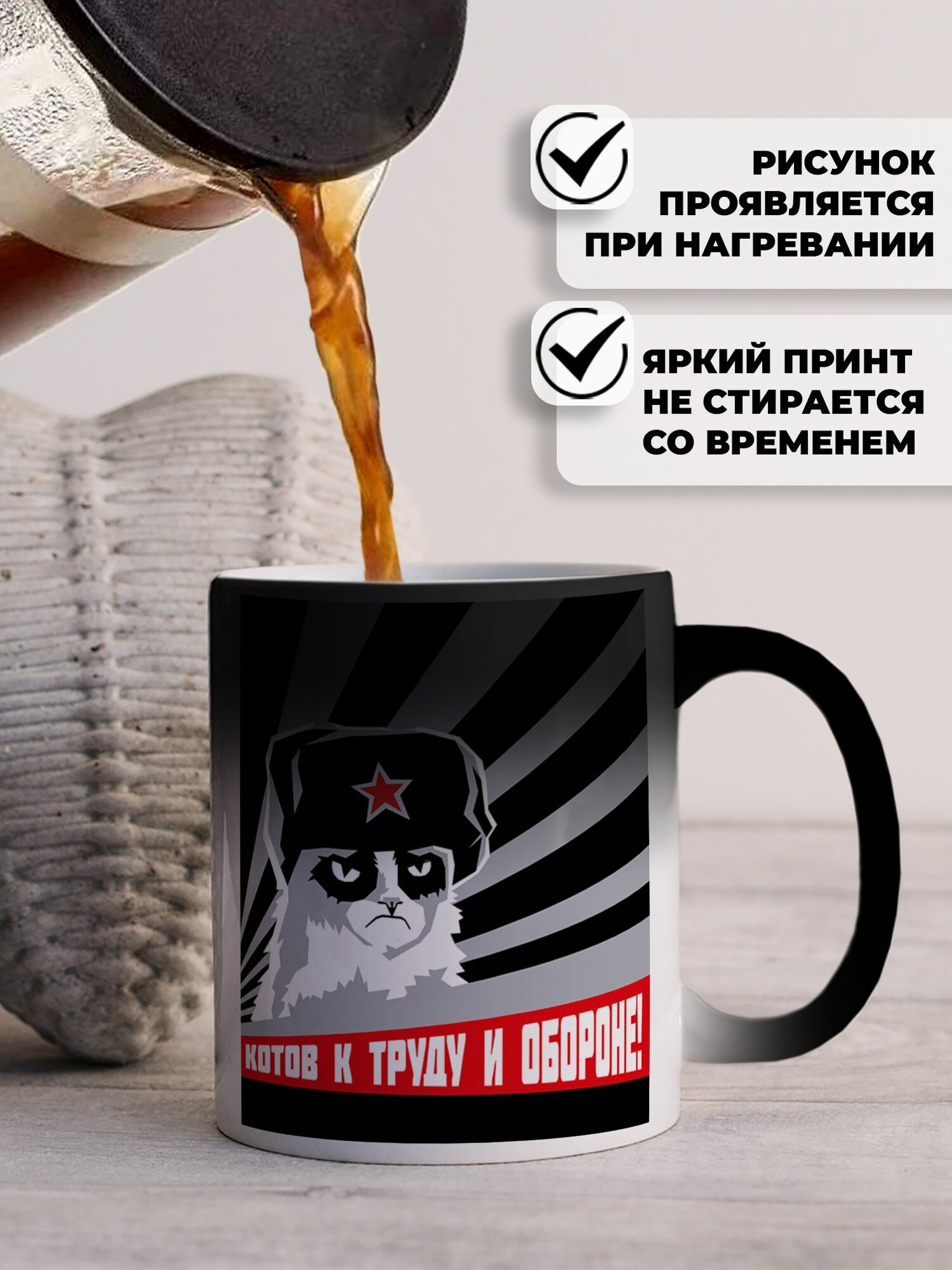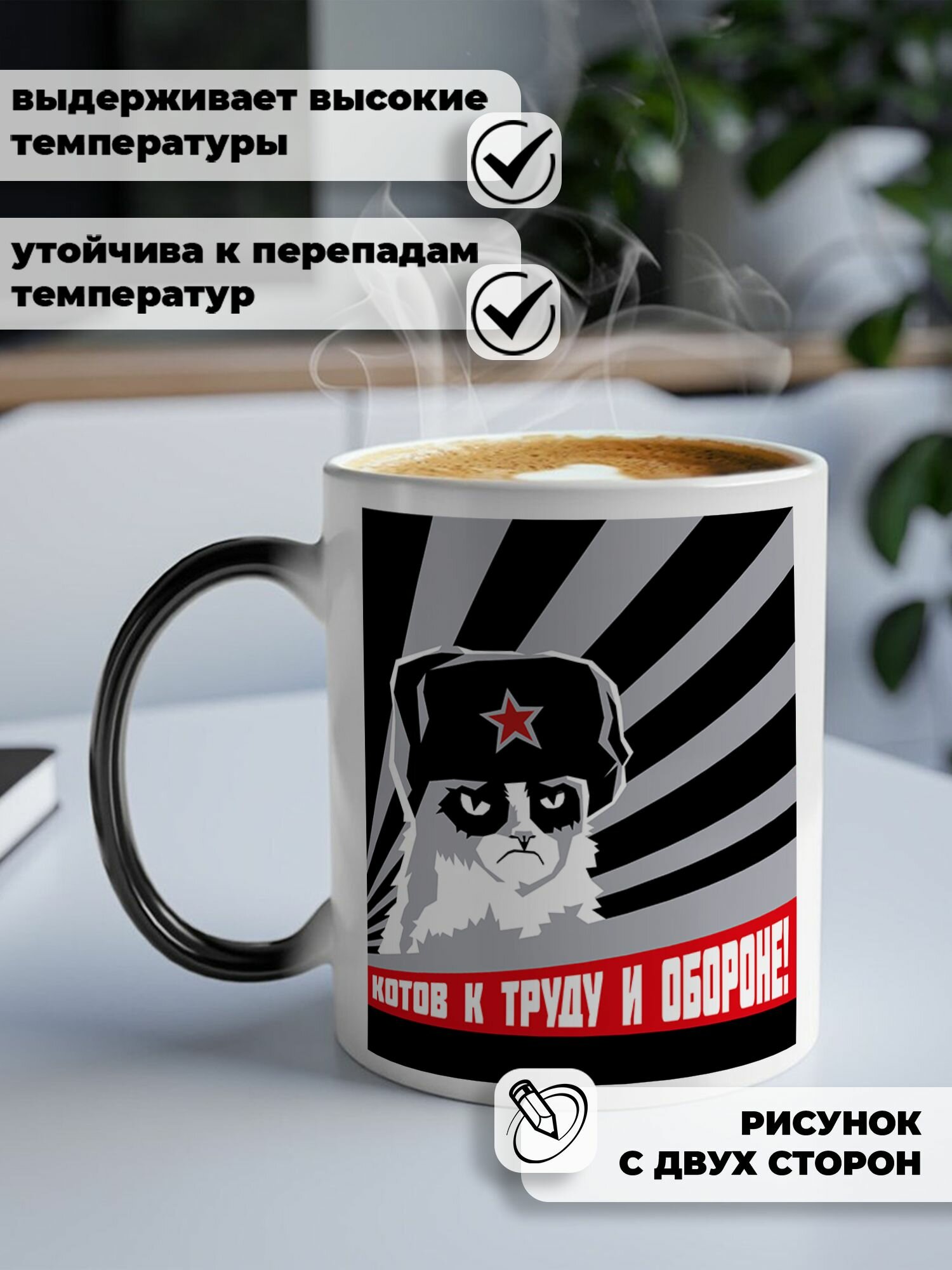 Ниже Вы можете прочитать отзывы на Кружка хамелеон для чая и кофе подарок с приколом, принтом и надписью "Котов к труду и обороне СССР", ознакомится с подробными характеристиками, посмотреть интересные обзоры и фотографии на Кружка хамелеон для чая и кофе подарок с приколом, принтом и надписью "Котов к труду и обороне СССР".