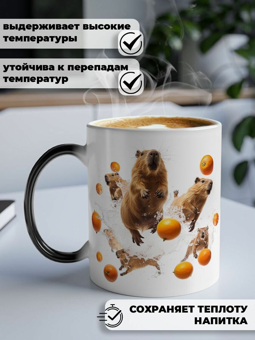 СохранитьКружка хамелеон для чая и кофе подарок с приколом и принтом "Капибары в апельсинах" интересное:
