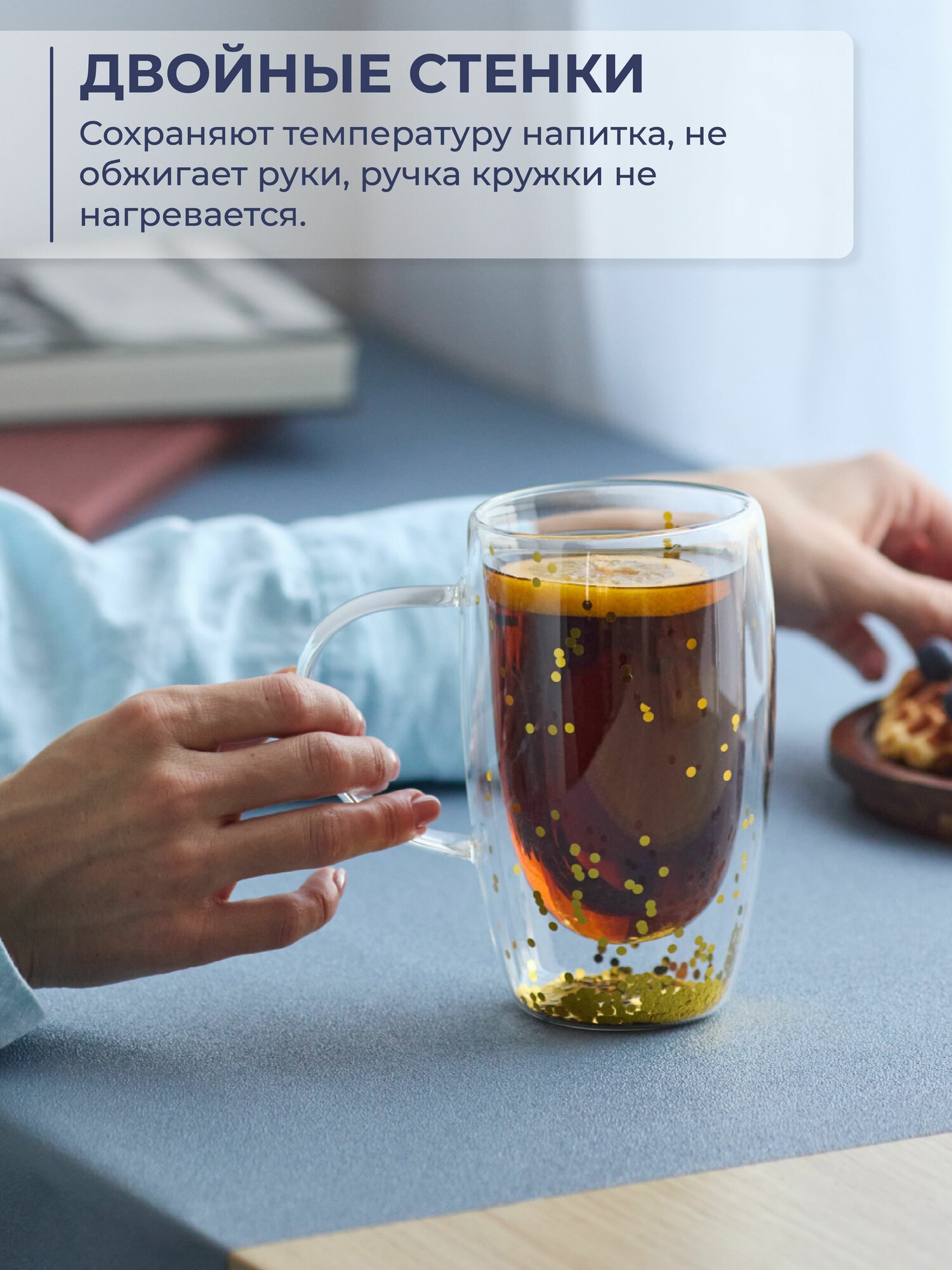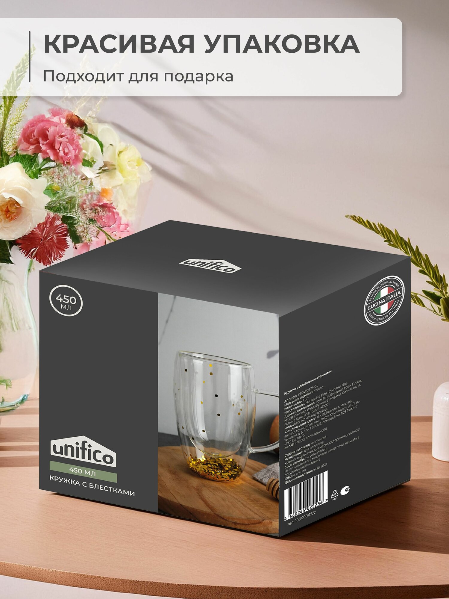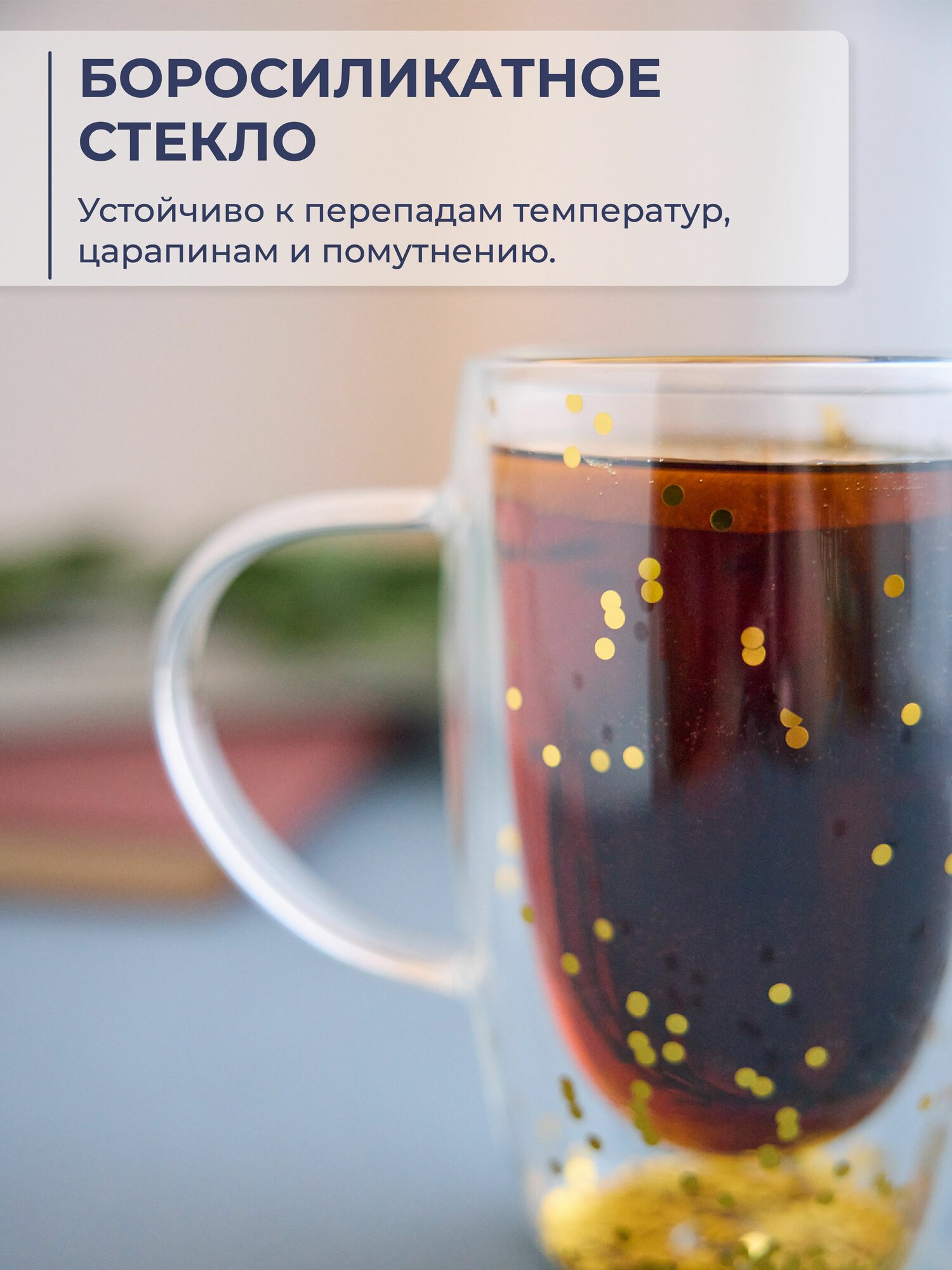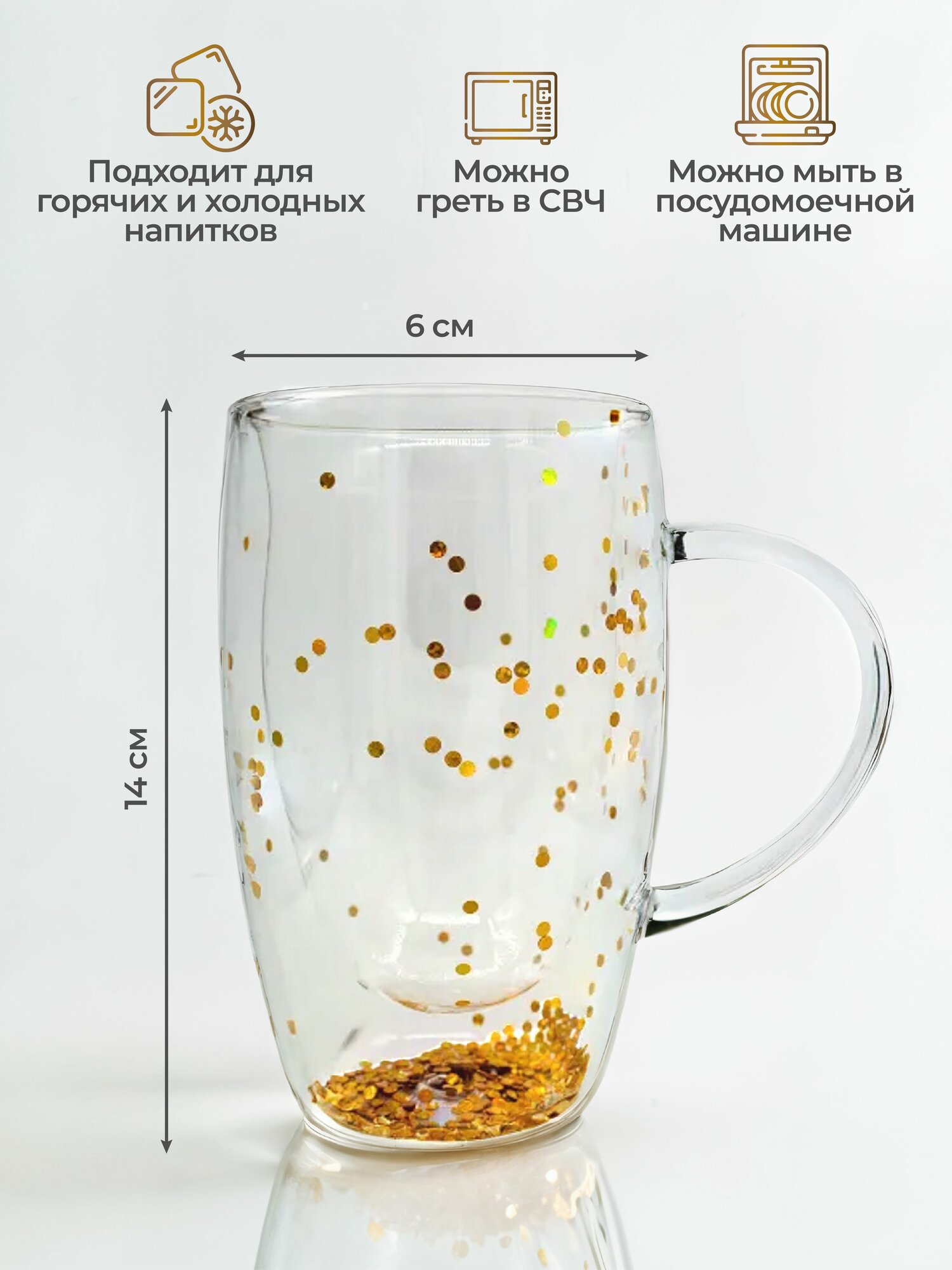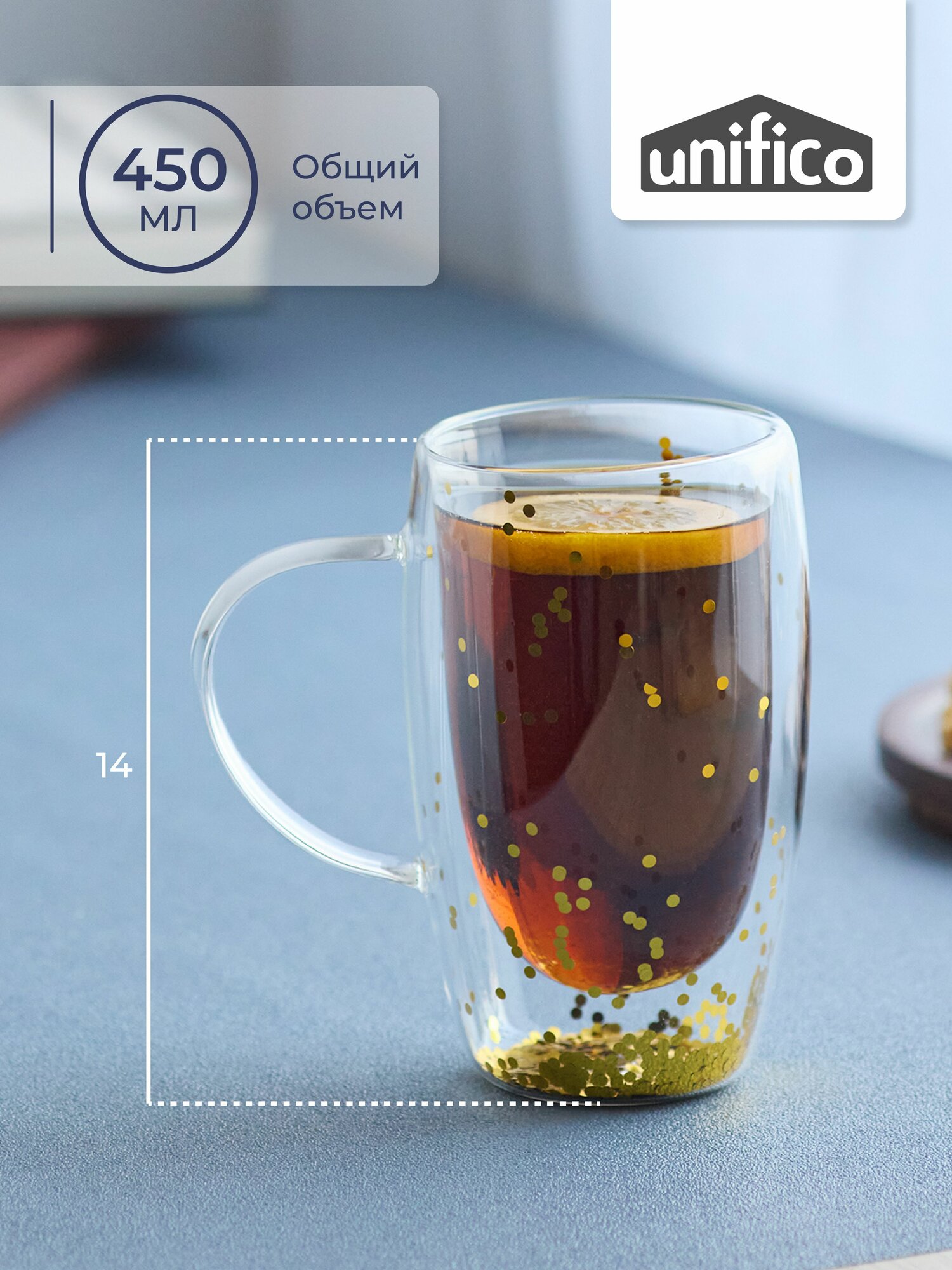 Кружка с двойными стенками из боросиликатного стекла Unifico 450 мл с золотыми блестками интересное: