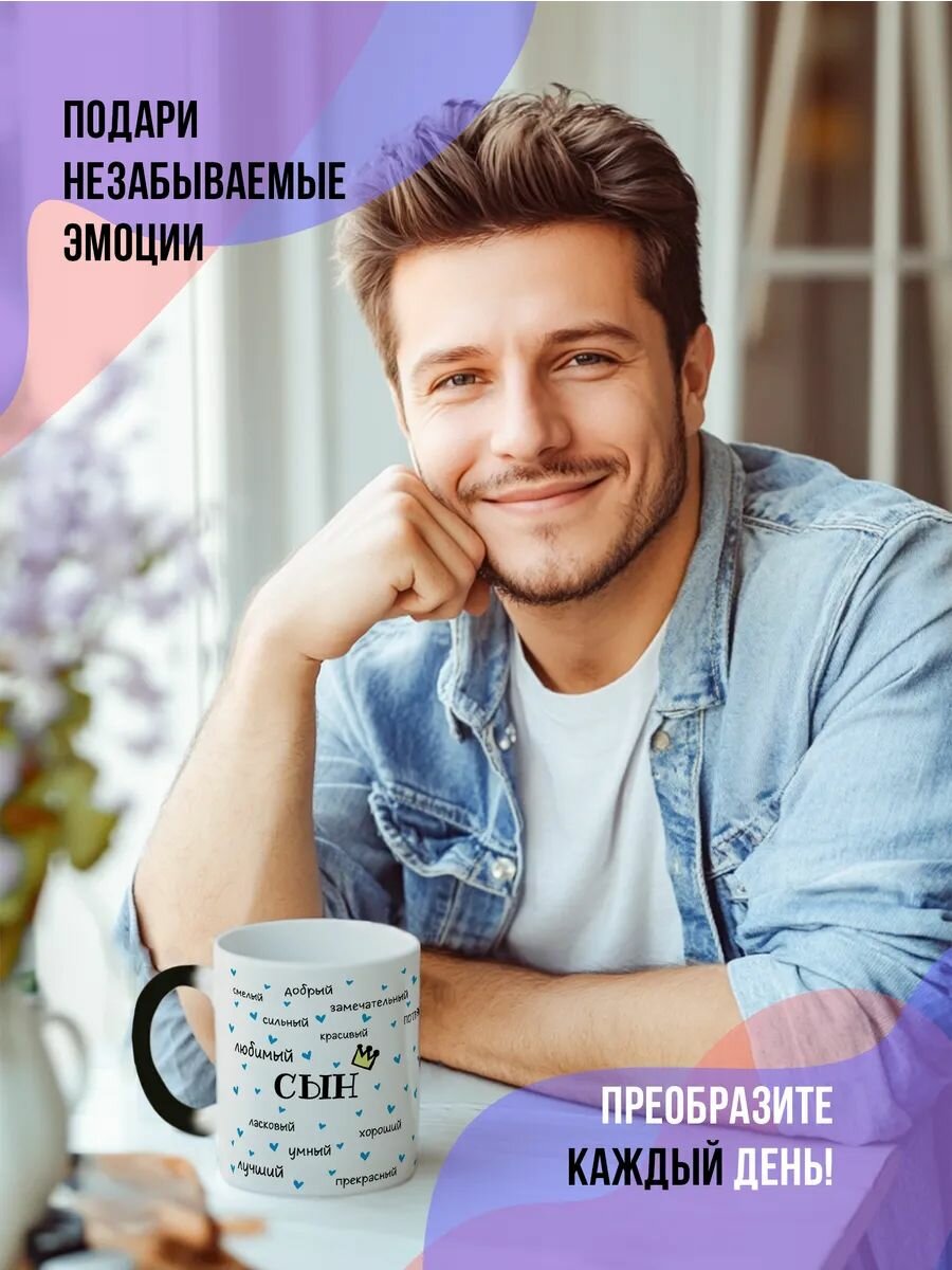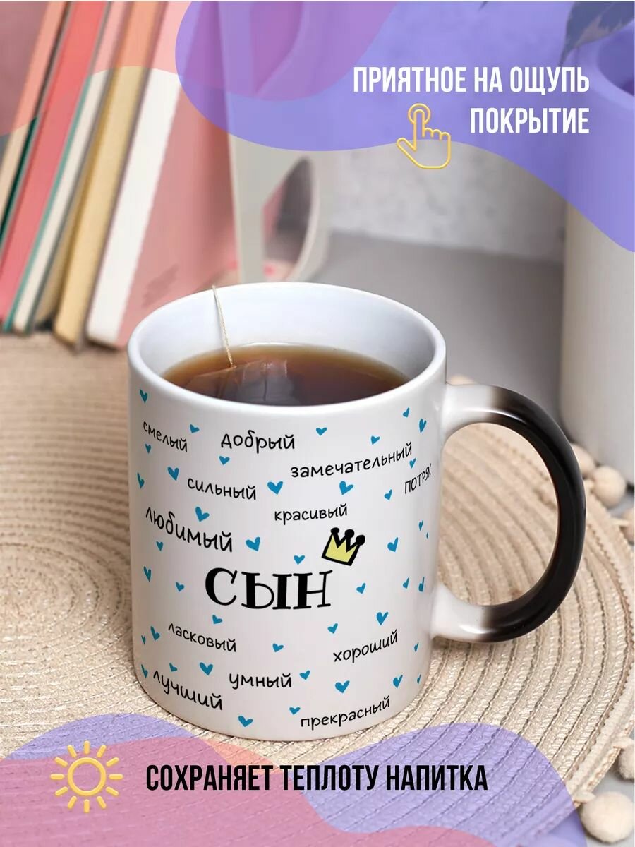 Кружка керамическая с приколом подарок сыну на день рождения с оживающим принтом "Комплименты сыну"