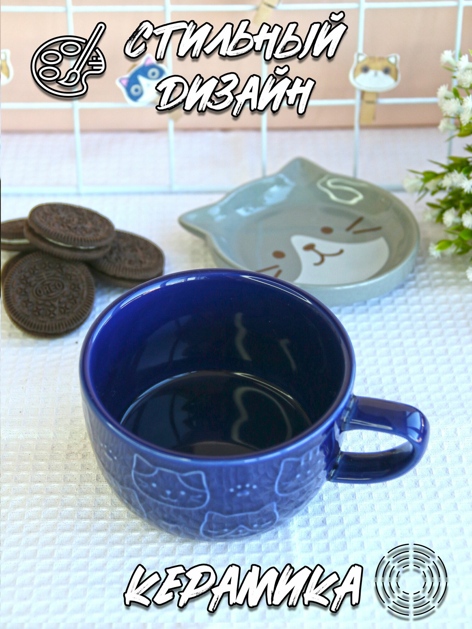 Кружка для чая с крышкой-тарелкой Котик 300 мл синяя интересное:
