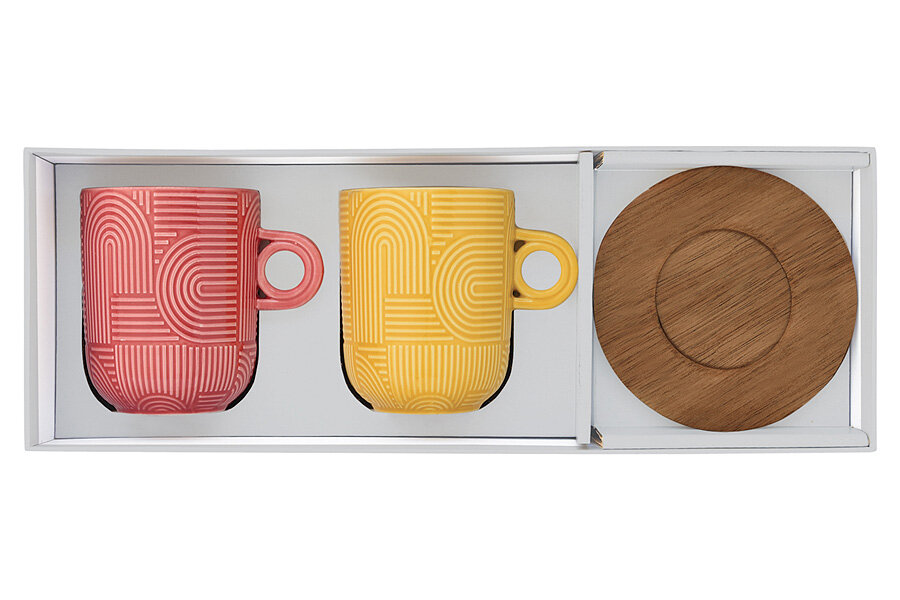 Купить Кружка, 350 мл, 2 шт, на подставке, фарфор P/дерево, красный/желтый, Take a loop