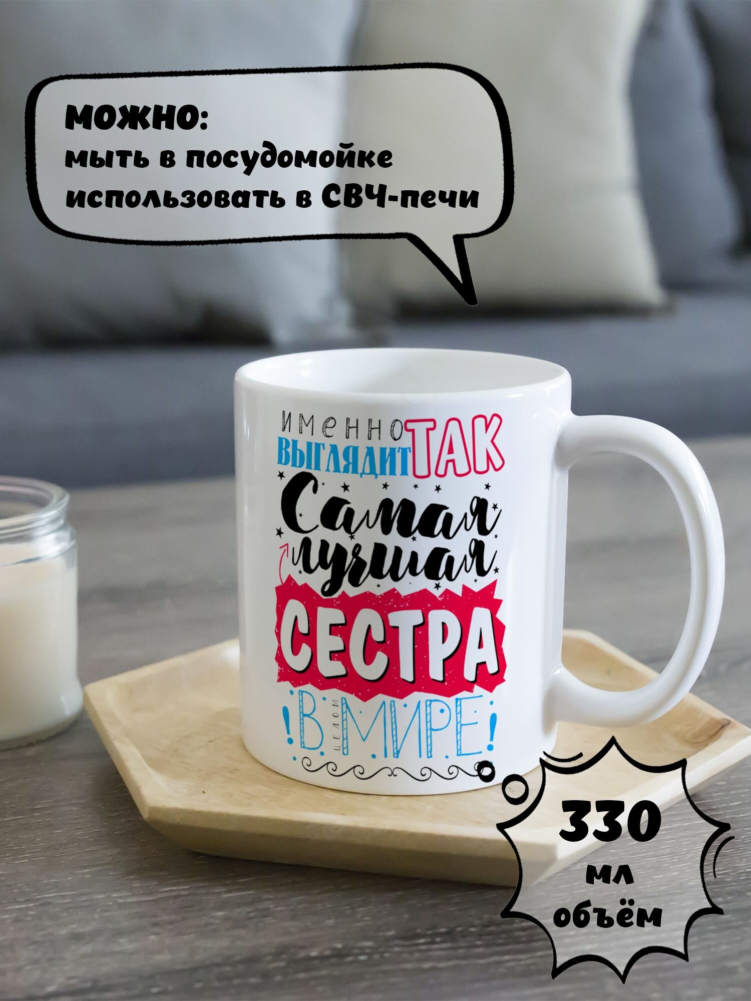 Ниже Вы можете прочитать отзывы на Кружка керамическая для чая и кофе подарок с принтом и надписью "Именно так выглядит самая лучшая сестра в Мире", ознакомится с подробными характеристиками, посмотреть интересные обзоры и фотографии на Кружка керамическая для чая и кофе подарок с принтом и надписью "Именно так выглядит самая лучшая сестра в Мире".