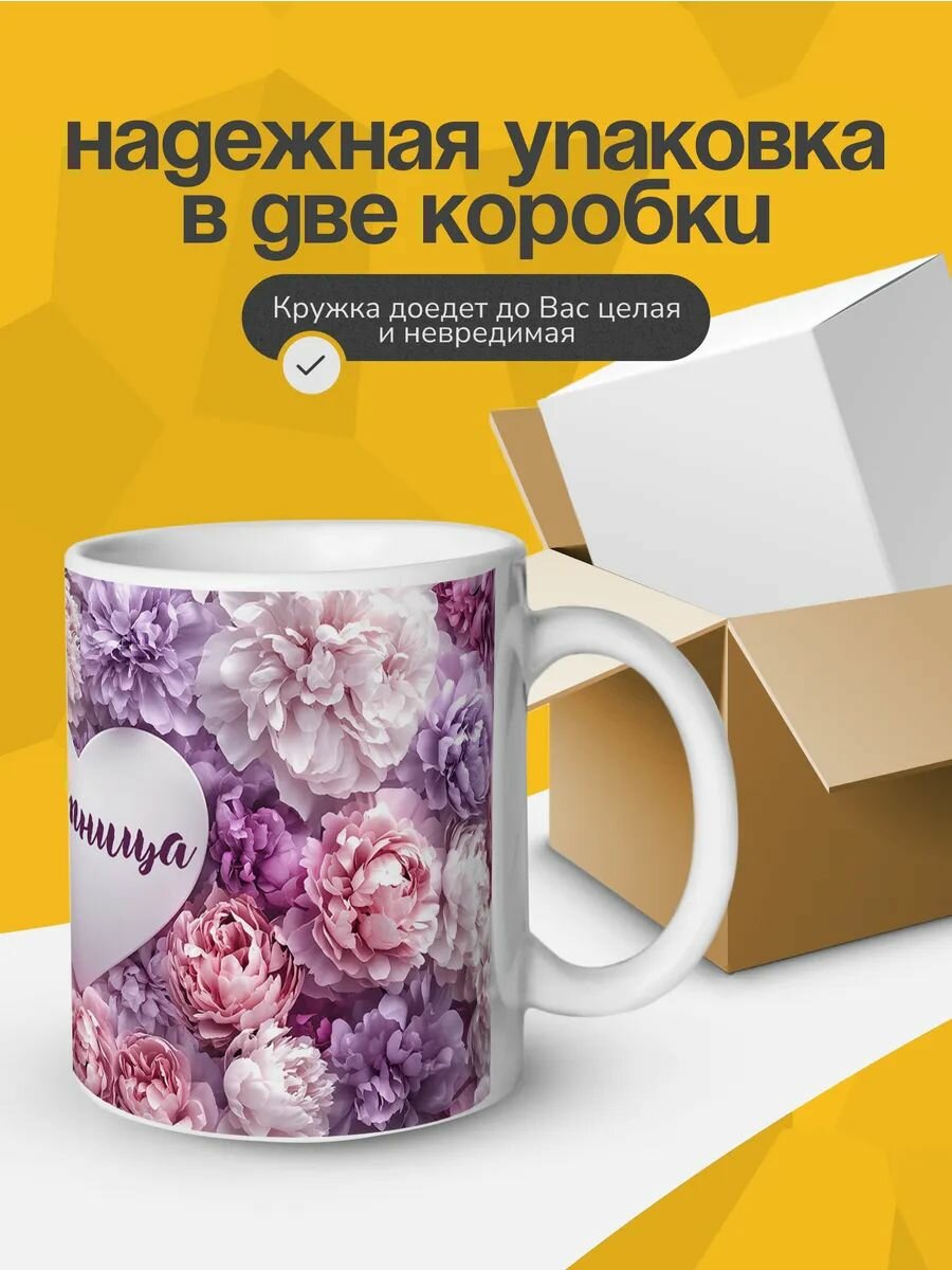 СохранитьКружка керамическая для чая и кофе с принтом и надписью подарок крестнице "Пионы - крестница" интересное: