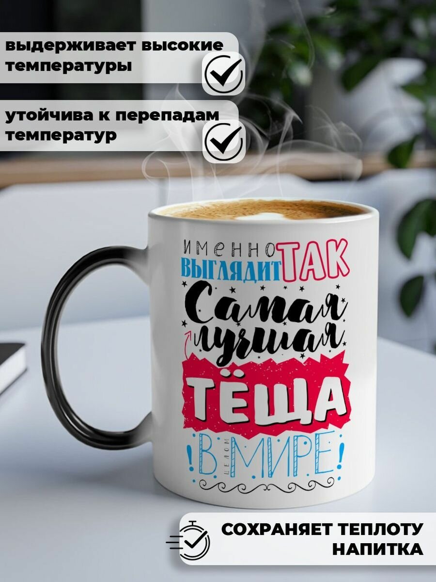 Ниже Вы можете прочитать отзывы на Кружка хамелеон для чая и кофе с приколом подарок теще "Самая лучшая теща в Мире", ознакомится с подробными характеристиками, посмотреть интересные обзоры и фотографии на Кружка хамелеон для чая и кофе с приколом подарок теще "Самая лучшая теща в Мире".