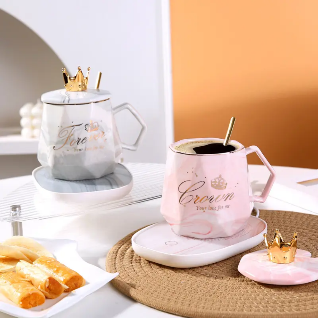 Кружка керамическая с подогревом, 380мл, (подарочный набор) / Кружка с подогревом розовая с короной
