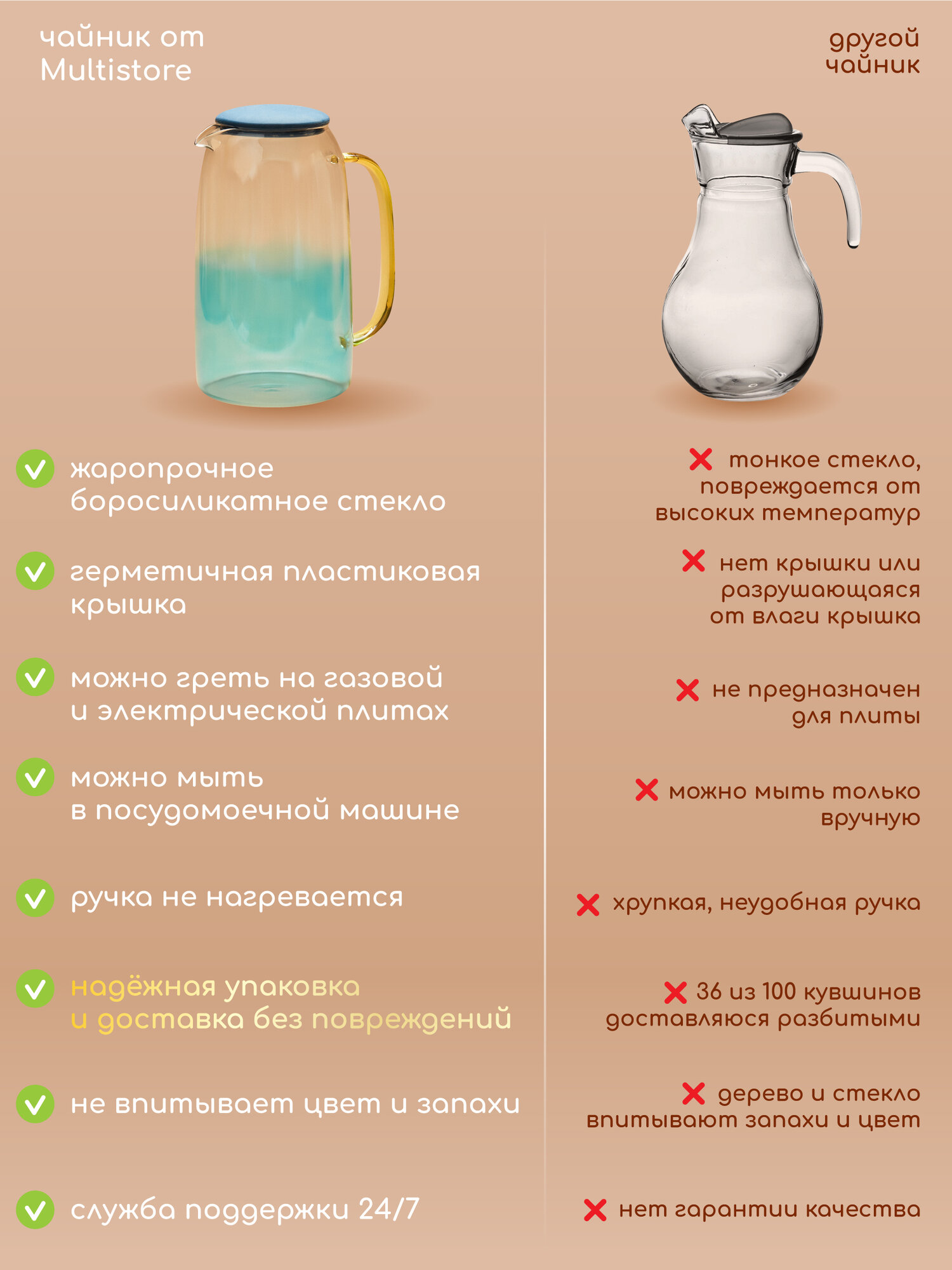 Графин (кувшин) цветной стеклянный для воды с крышкой из силикона термостойкий для горячих и холодных напитков, 1500мл интересное: