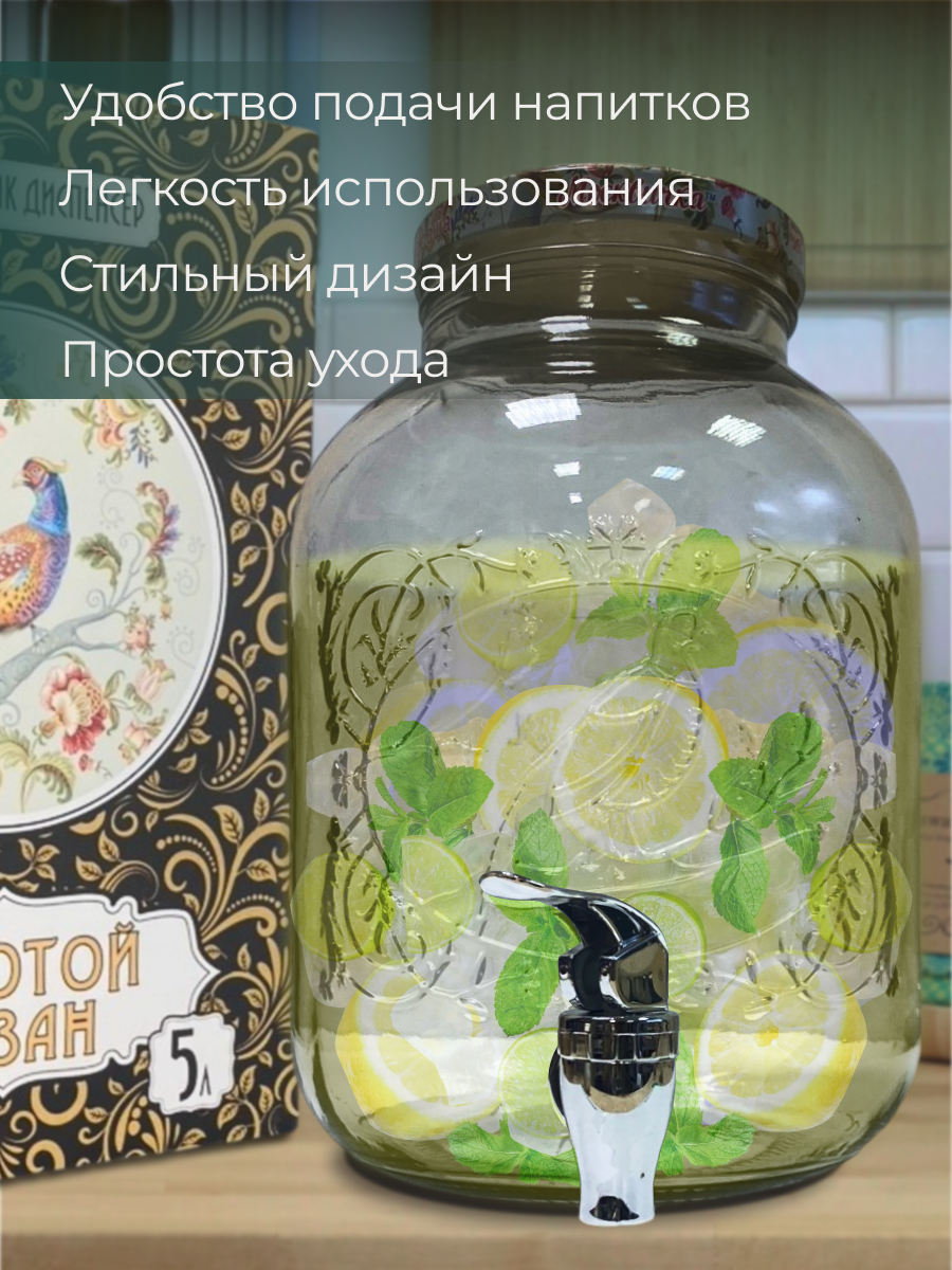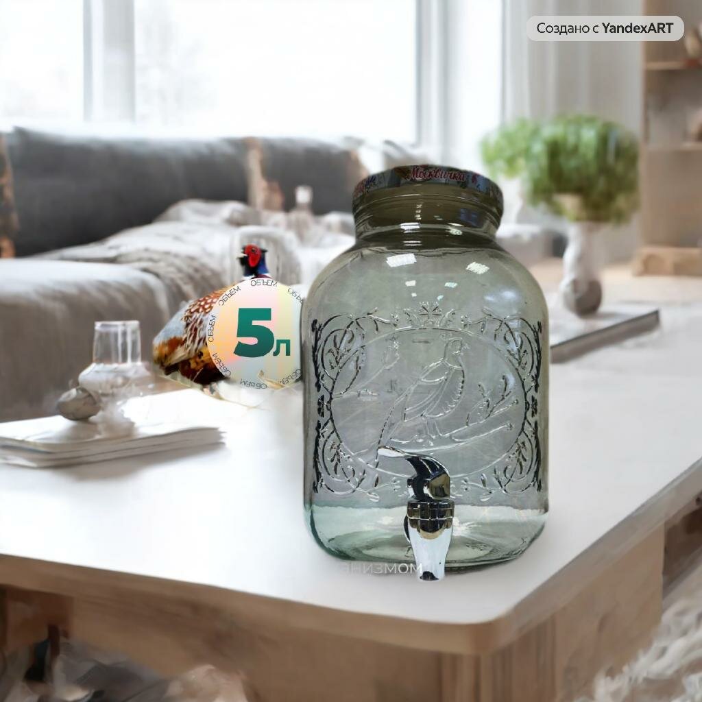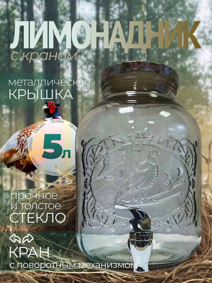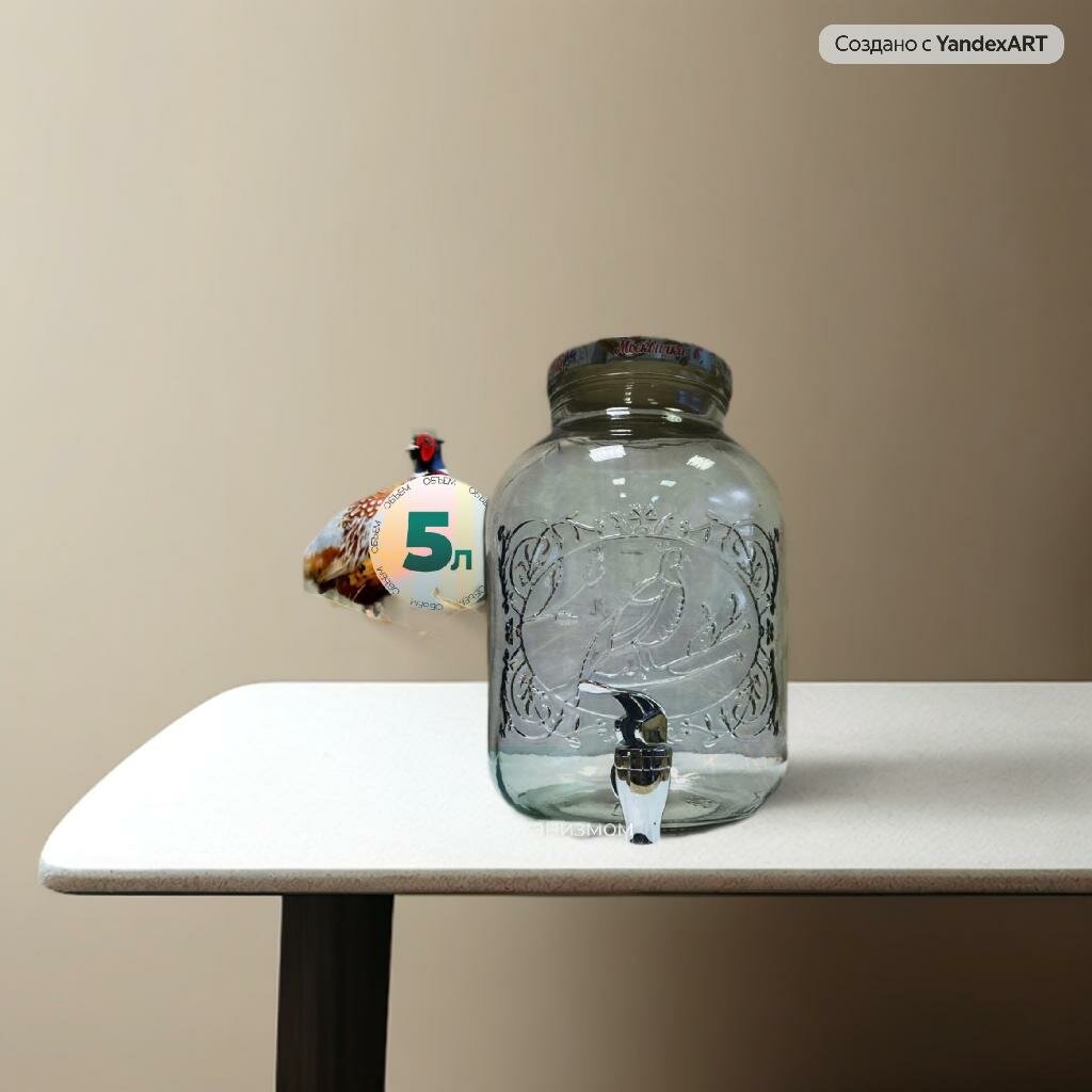 Лимонадник 5 литров с краном "ФАЗАН ", диспенсер для лимонада, напитков, чайного гриба, прозрачный стекло интересное: