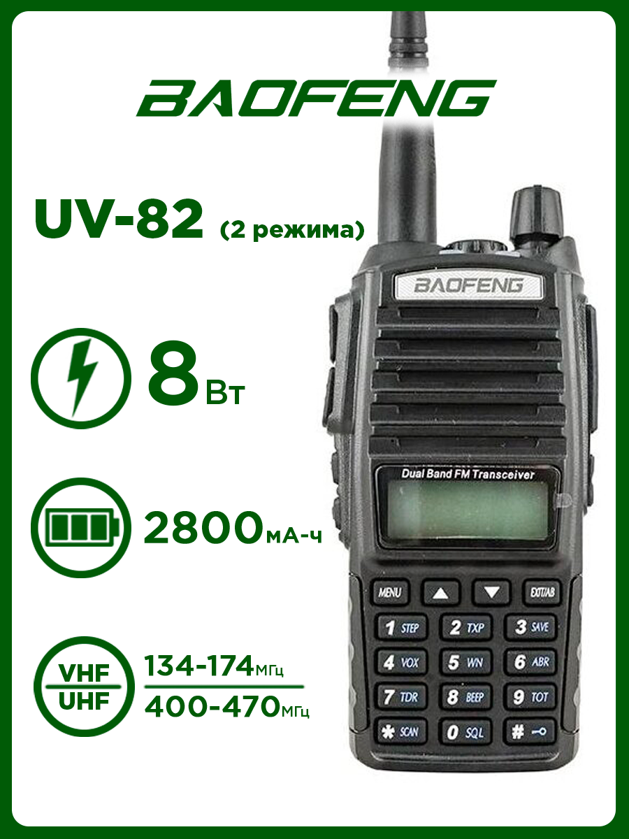 Рация Baofeng UV-82 (8W) Черная 2 режима / Портативная радиостанция Баофенг для охоты и рыбалки с аккумулятором на 2800 мА*ч и радиусом 10 км