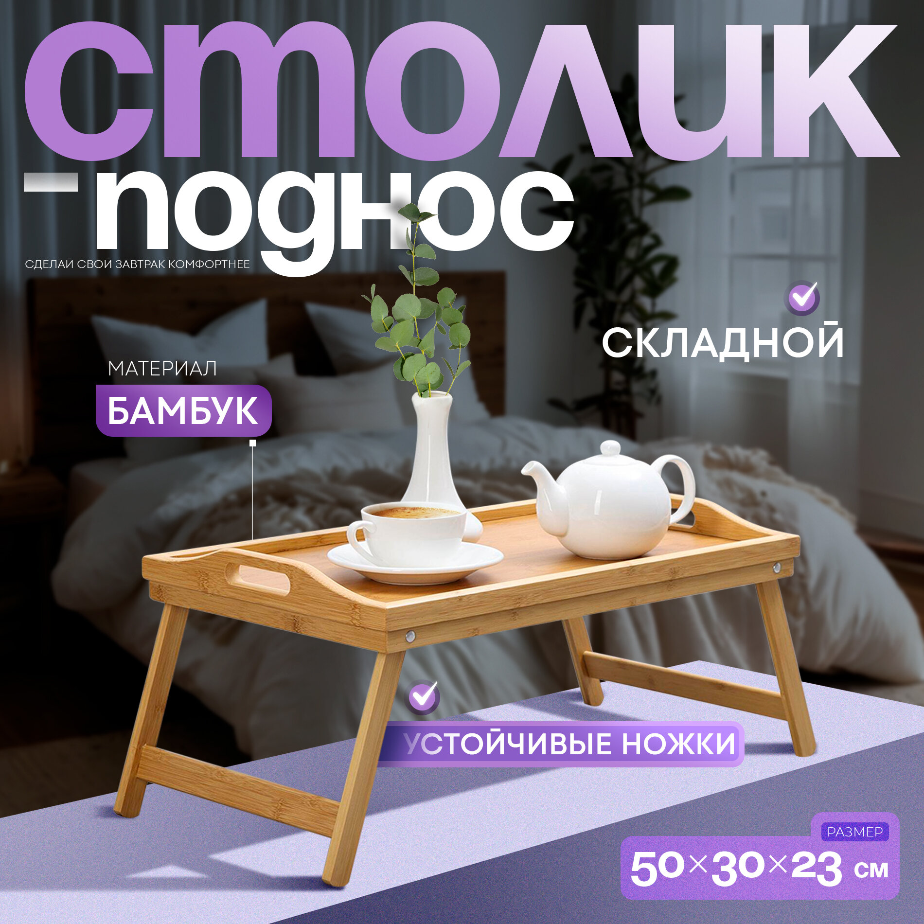 Купить Столик поднос для завтрака с ножками «Забота», 50×30×25 см бамбук