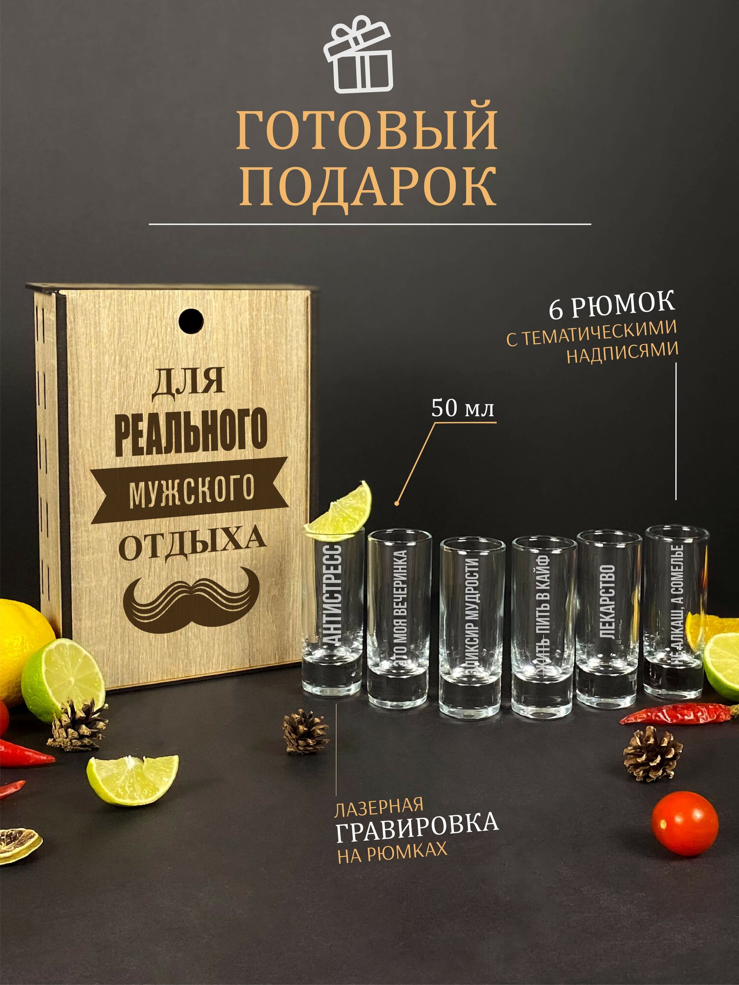 Купить Подарочный набор стопок Для реального мужского отдыха. Рюмки для водки, коньяка, текилы в подарок мужчине на день рождения.