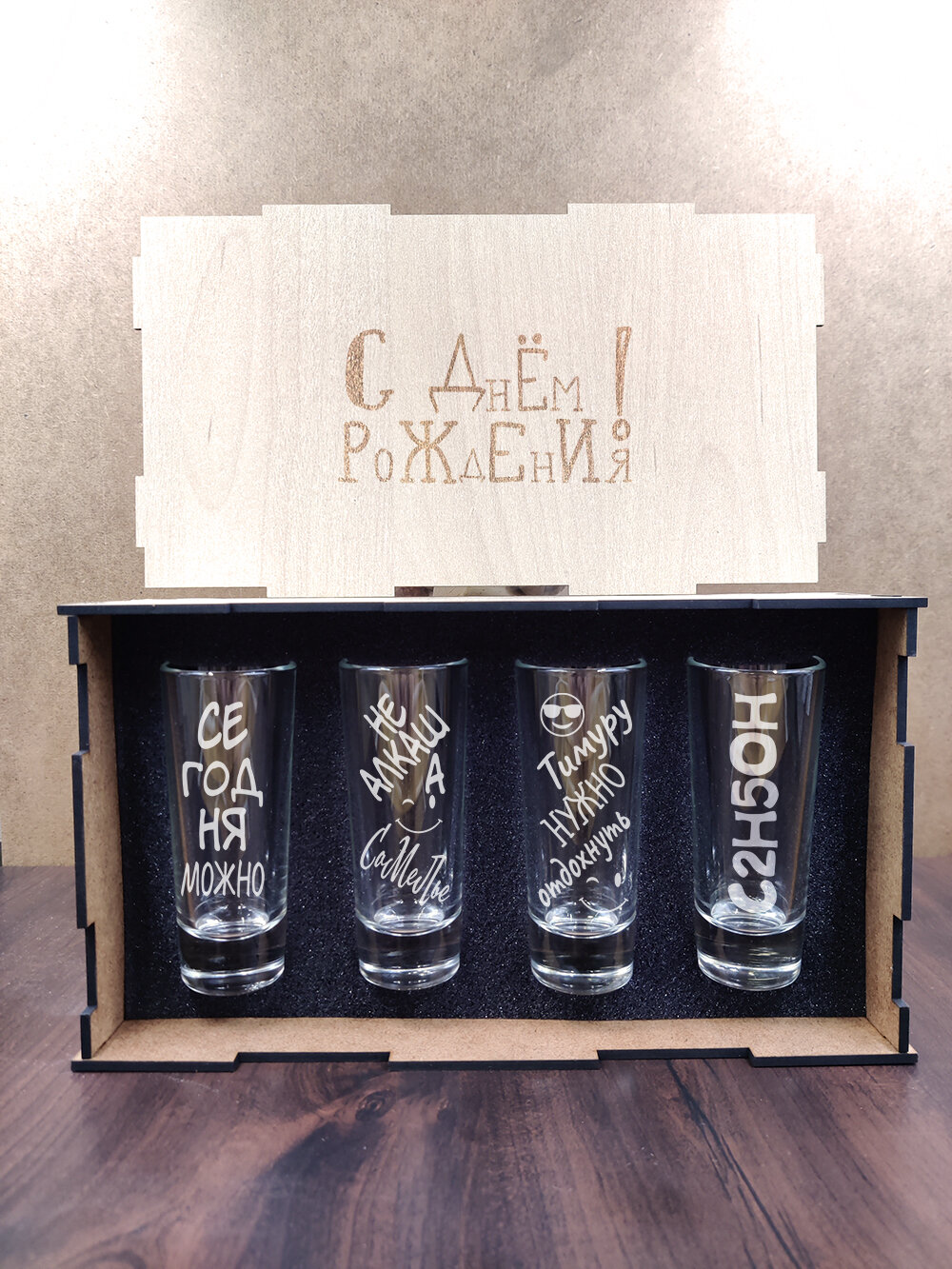 СохранитьПодарочный набор стопок в коробке с гравировкой - ДР Тимур интересное: