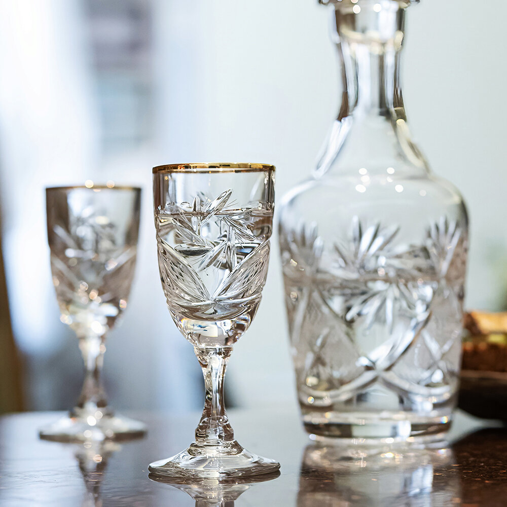 Хрустальные рюмки на ножке для водки, ликера, крепких напитков, 35 мл. набор 6 шт. Неман 1000/30, 7931/35гр золото интересное: