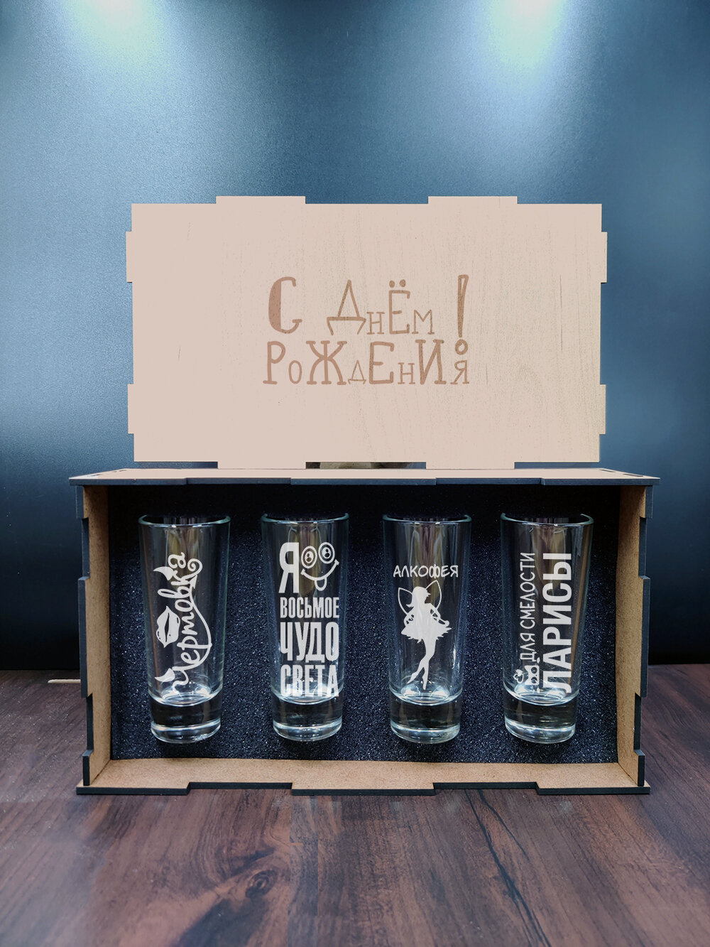 СохранитьПодарочный набор стопок в коробке с гравировкой - ДР Лариса интересное: