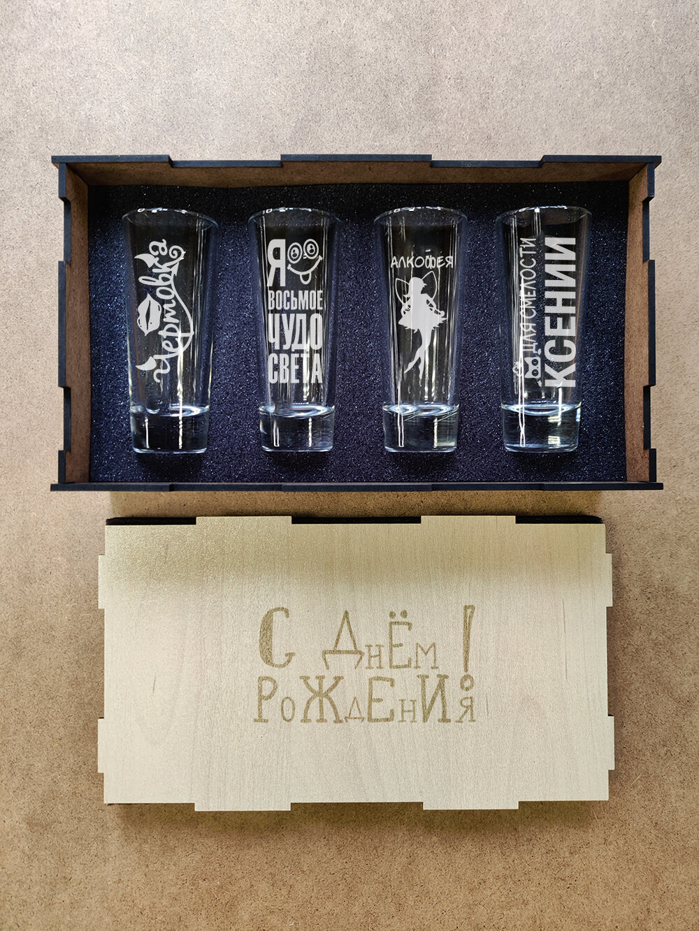 СохранитьПодарочный набор стопок в коробке с гравировкой - ДР Ксюша интересное: