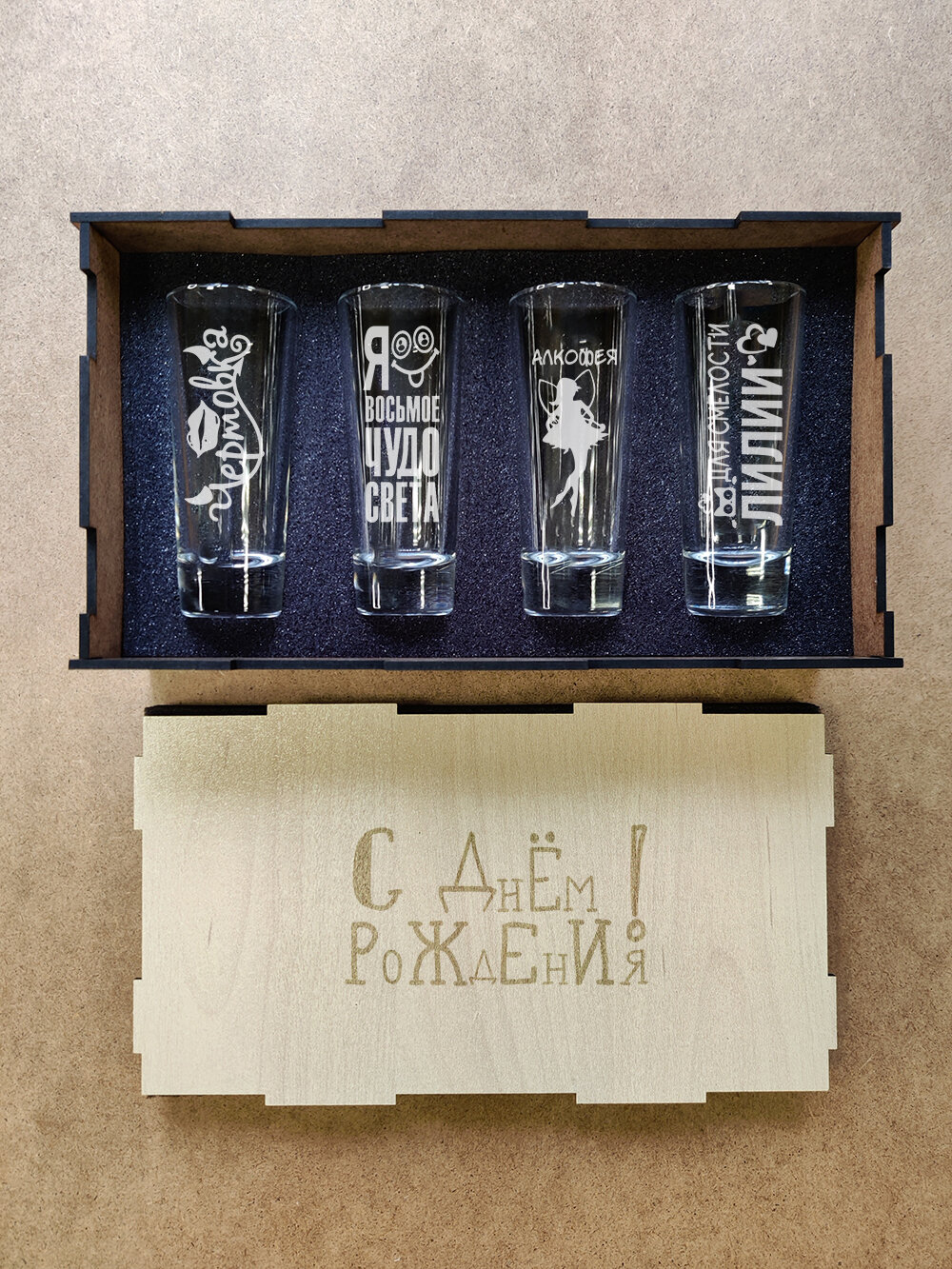 СохранитьПодарочный набор стопок в коробке с гравировкой - ДР Лиля интересное: