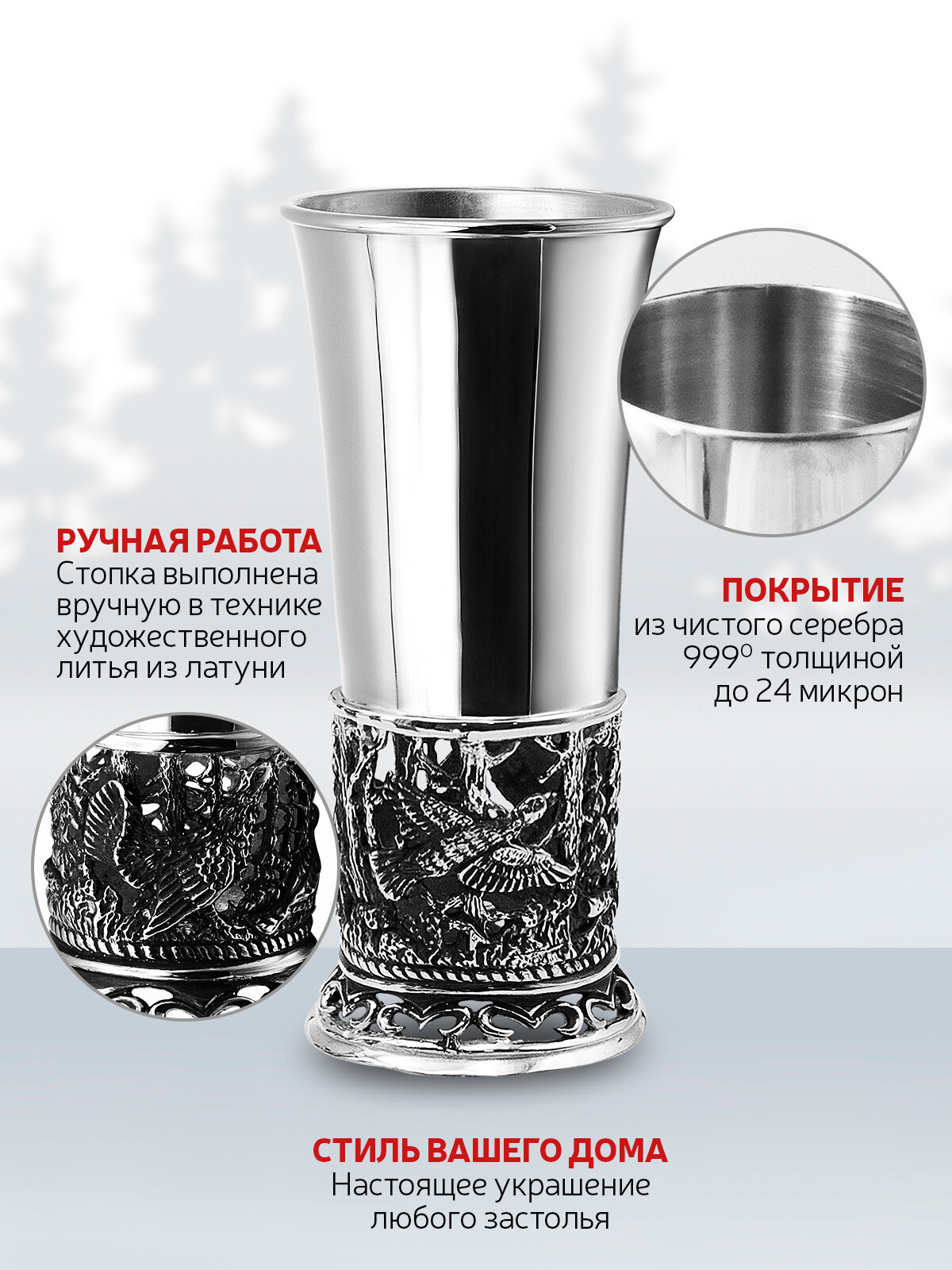 Купить Стопка "Глухари" посеребренная полированная с чернением