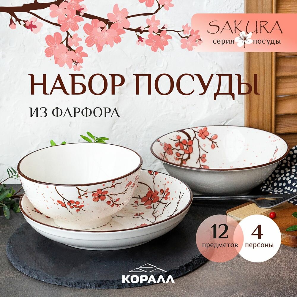 Купить Набор посуды из фарфора на 4 персоны 12 предметов "Sakura" набор№2, столовый сервиз обеденный