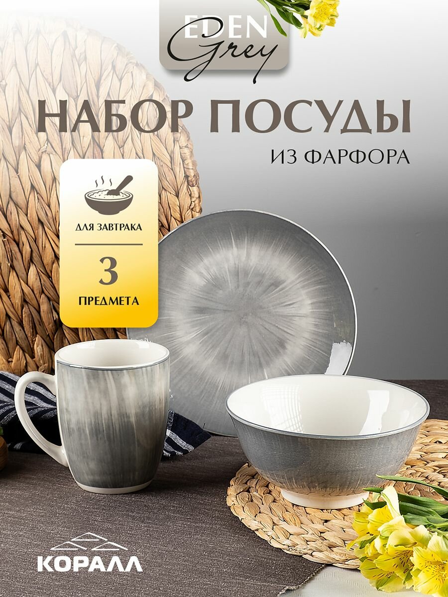Купить Набор посуды на 1 персону 3 предмета фарфор "Eden grey", столовый сервиз обеденный для завтрака