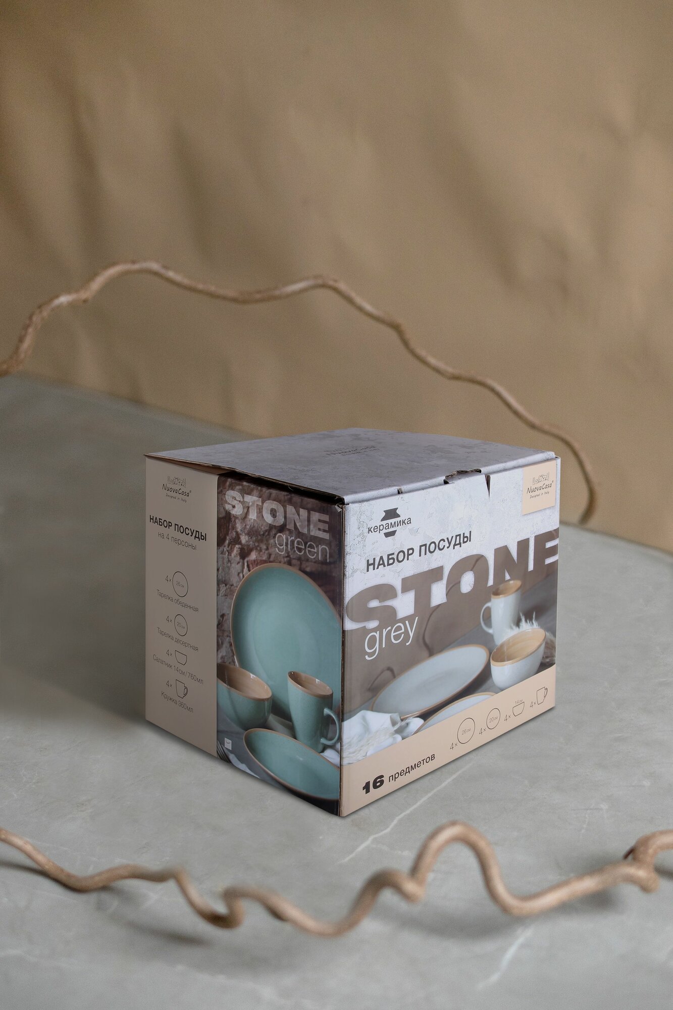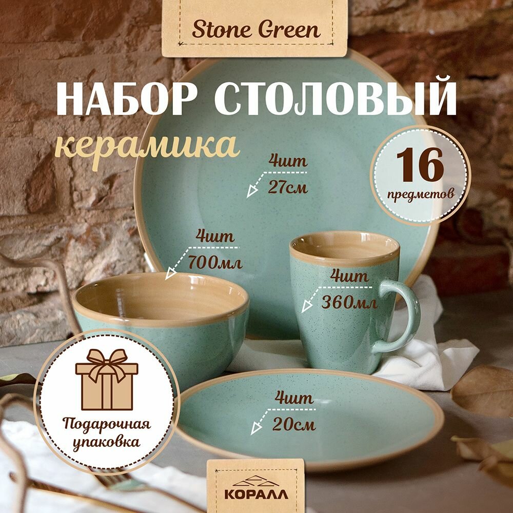 Купить Набор посуды на 4 персоны 16 предметов "Stone green" керамика. Сервиз столовый обеденный в подарочной упаковке.