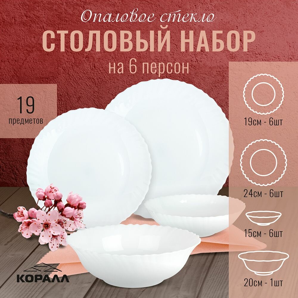 Купить Набор посуды на 6 персон 19 предметов "Classic" стеклокерамика опаловое стекло. Столовый сервиз обеденный набор тарелок с салатниками