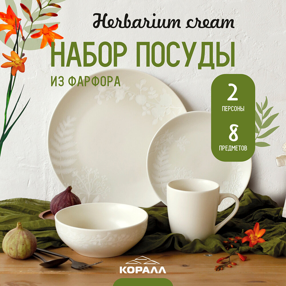 СохранитьНабор посуды фарфор на 2 персоны 8 предметов "Herbarium cream", столовый сервиз обеденный интересное: